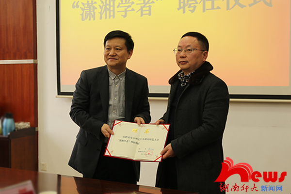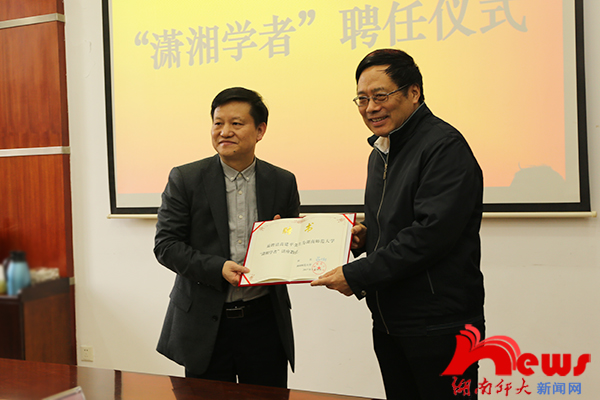 蒋洪新依次为三位“潇湘学者”颁发聘书。