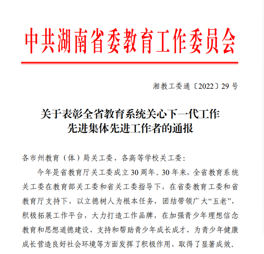 近日,省委教育工委印发《关于表彰全省教育系统关心下一代工作先进集体先进工作者的通报》,表彰了一批全省从事关心下一代工作的先进集体和个人。公司共有6个集体、12名个人获奖,实现五大奖项全覆盖。其中,公司关工委获得“先进集体”表彰,院关工委常务副主任陈业爱老师获先进工作者。