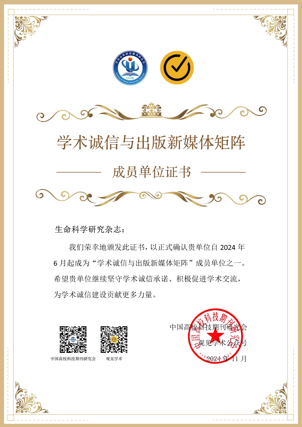 此次证书的颁发,不仅是对首批成员单位的认可,更是对学术诚信与新媒体矩阵未来发展的期待。通过矩阵的共同努力,将进一步推动学术诚信理念的传播,优化学术出版环境,为我国科研事业发展保驾护航。