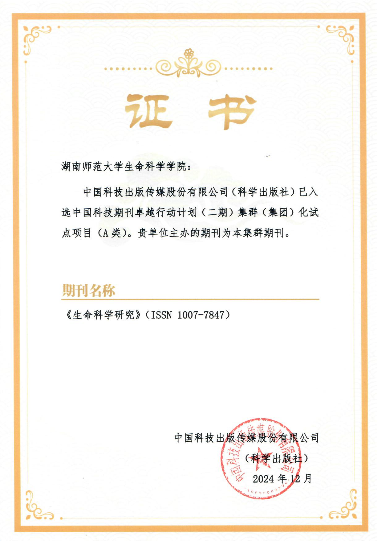 近日,中国科技期刊卓越行动计划二期(2024—2028年)项目入选项目公布。中国科技出版传媒股份有限公司(科学出版社)已入选中国科技期刊卓越行动计划(二期)集群(集团)化试点项目(A类)。由本院主办的期刊《生命科学研究》为该集群期刊,这标志着《生命科学研究》高质量发展将迎来新平台、新契机。