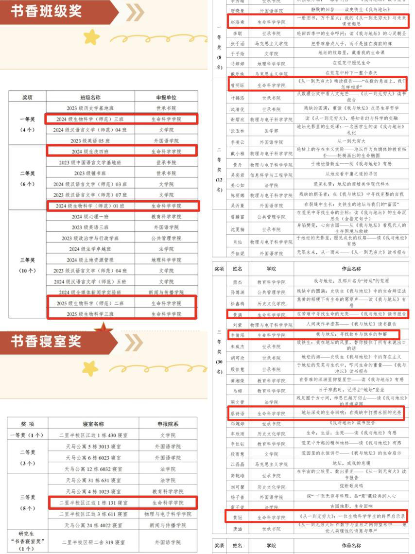 在本次“一校一书”活动中,共获14项荣誉。在集体奖项中,在本次 “一校一书” 活动中,公司师生凝心聚力、深耕阅读,共斩获 14 项荣誉佳绩,尽显书香育人成效。集体奖项方面,公司申报的《“书香寝室” 育人新模式的探索与实践》,凭借创新性的阅读推广机制设计与扎实丰富的活动组织经验,从众多案例中脱颖而出,成功荣获 “创新案例奖”。班级作为阅读推广的重要阵地,此次也涌现出一大批先进典型,24级生科三班荣获校级“书香班级奖”一等奖24级生技四班、24级生科一班荣获校级“书香班级奖”二等奖25级生科二班、25级生科三班荣获校级“书香班级奖”三等奖