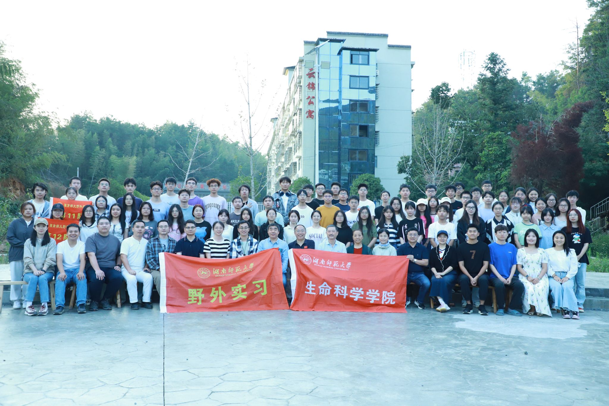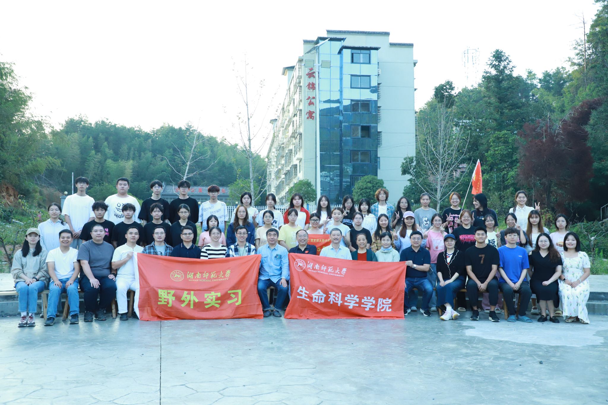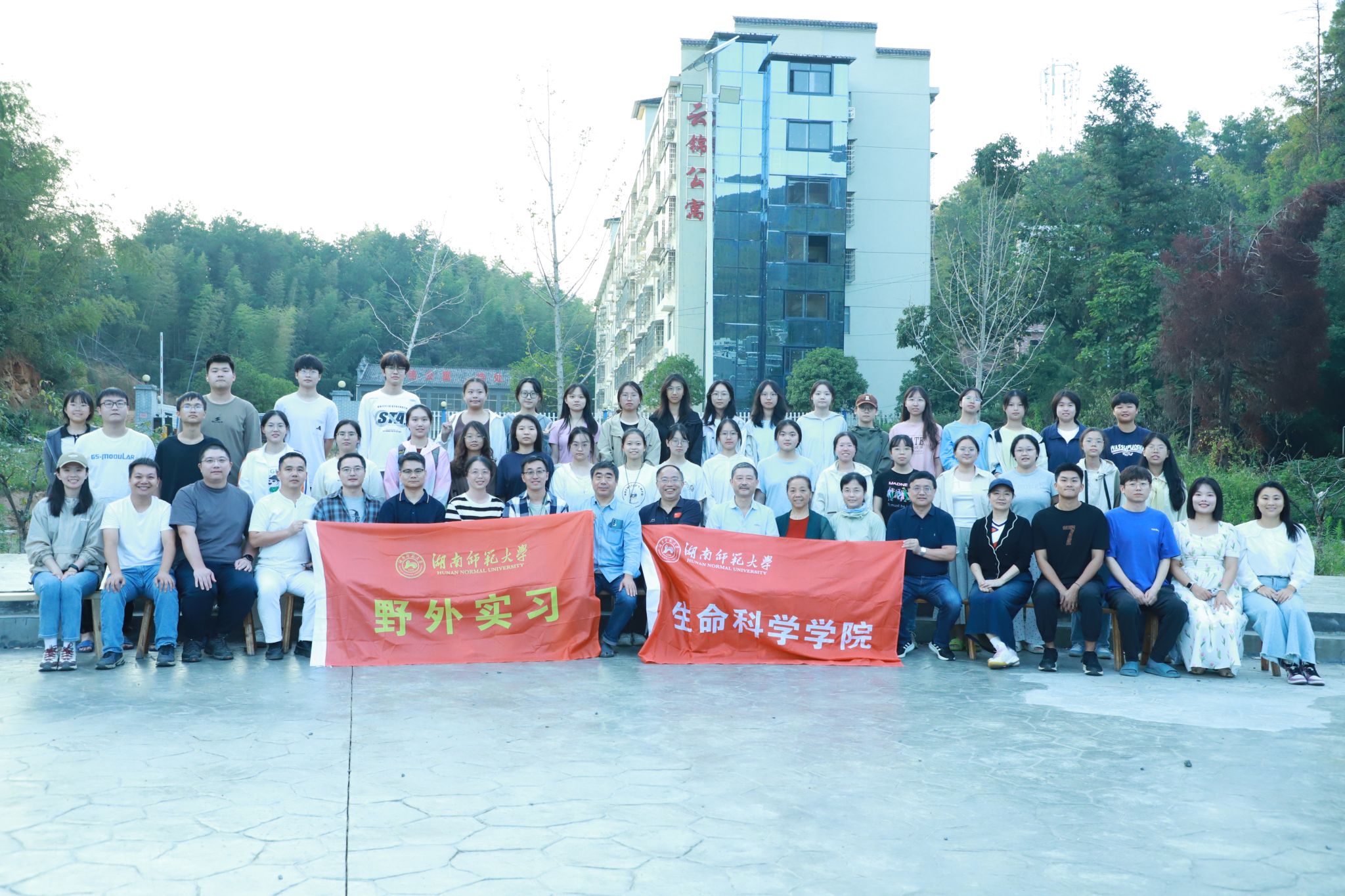 各位领导老师实地查看用餐、住宿等生活场所,了解了实习工作的开展情况和后勤保障工作,并为全体师生发放慰问物品。在走访过程中,各位领导老师观看员工实习期间制作的动植物标本,对同学们的实习工作成果给予充分肯定。随后,蒋能胜于石板广场发表讲话,对指导教师的辛勤付出表示衷心感谢,并对同学们的精神面貌、认真的学习态度和吃苦耐劳的品质表示赞扬。最后,蒋能胜等生科院领导与全体老师及同学们在石板广场进行合照。