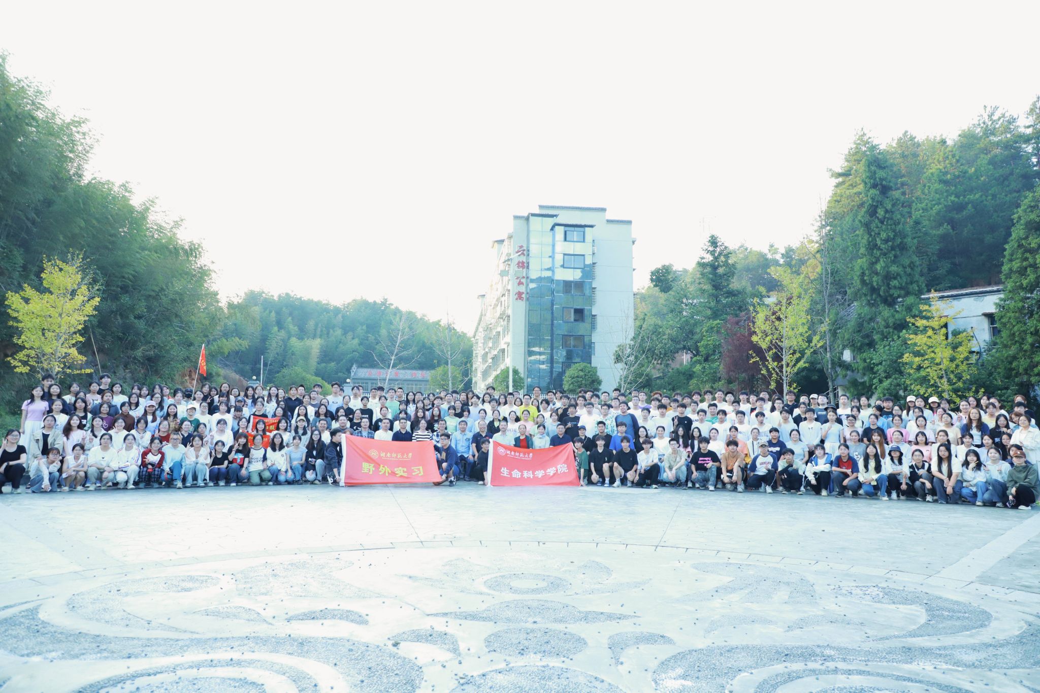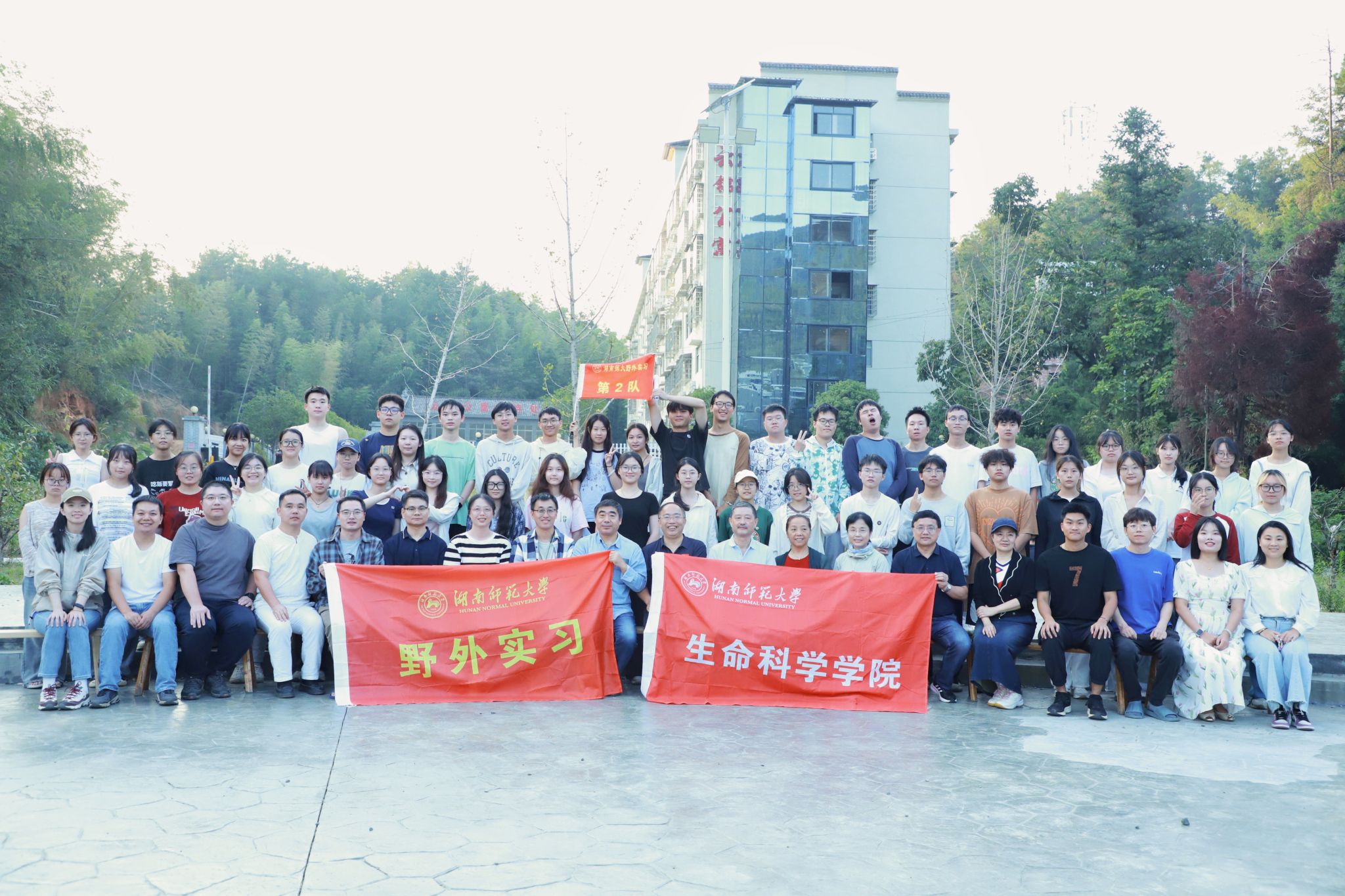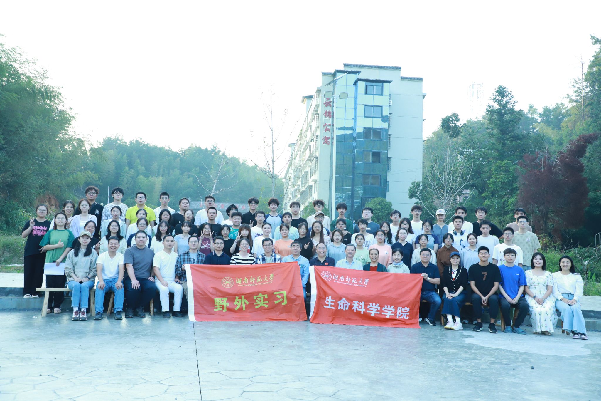 各位领导老师实地查看用餐、住宿等生活场所,了解了实习工作的开展情况和后勤保障工作,并为全体师生发放慰问物品。在走访过程中,各位领导老师观看员工实习期间制作的动植物标本,对同学们的实习工作成果给予充分肯定。随后,蒋能胜于石板广场发表讲话,对指导教师的辛勤付出表示衷心感谢,并对同学们的精神面貌、认真的学习态度和吃苦耐劳的品质表示赞扬。最后,蒋能胜等生科院领导与全体老师及同学们在石板广场进行合照。