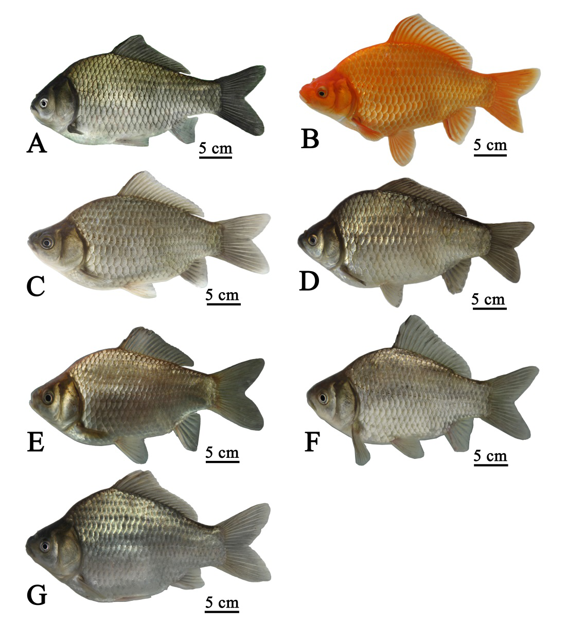 E :合方鲫F3外形图;F:合方鲫F4外形图;G:合方鲫2号外形图