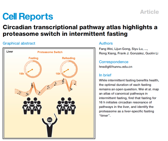10月25日,公司李国林教授课题组在Cell子刊Cell Reports在线发表了最新研究论文“Circadian transcriptional pathway atlas highlights a proteasome switch in intermittent fasting”。beats365官方网站为第一通讯单位,李国林教授为唯一通讯作者,青年教师魏芳和博士研究生龚丽军为共同第一作者。