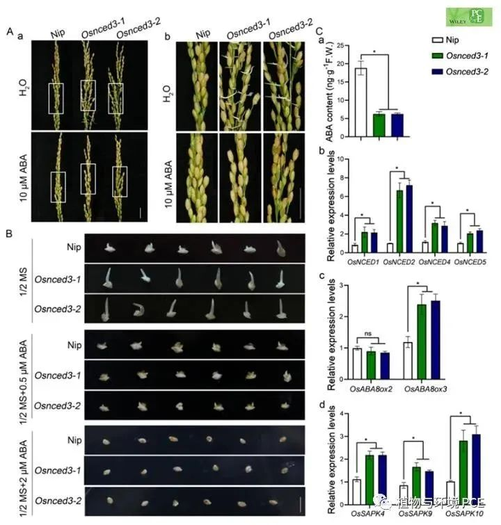 该研究为水稻OsNCED基因调节水稻穗发芽提供了直接证据,为提高水稻穗发芽抗性和谷粒大小提供了一个潜在的基因资源。