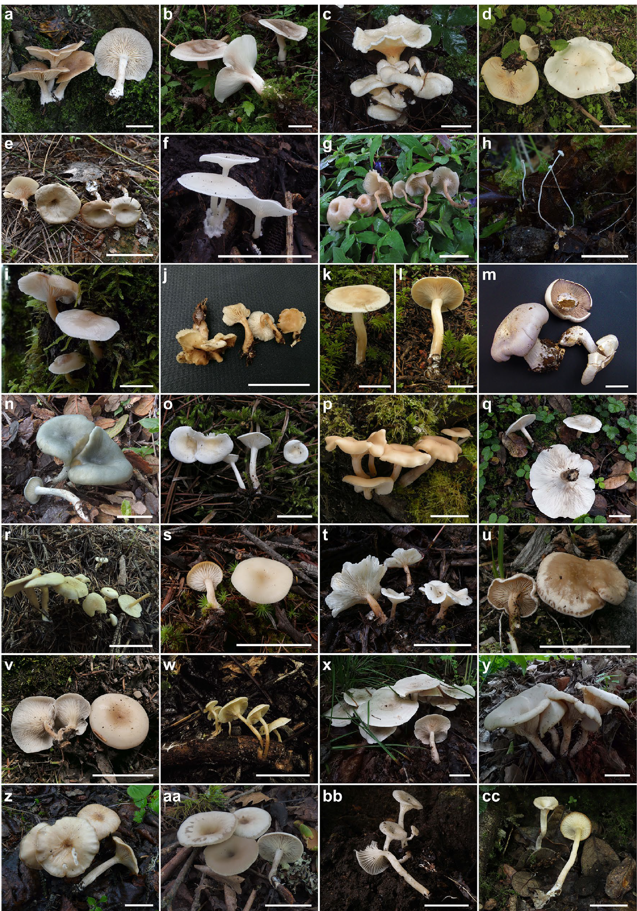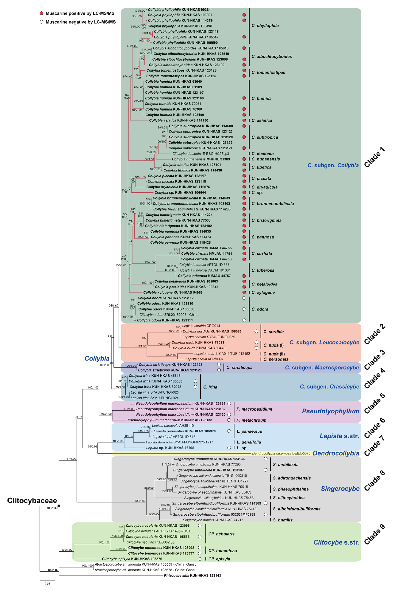 为了解决上述科学问题,何正蜜从beats365(中国区)-唯一官方网站博士毕业后前往中国科公司昆明植物研究所从事博士后科研工作(2019-2022年),在合作导师杨祝良研究员的指导下对杯伞科进行了系统研究。基于分子系统发育、外观形态、显微结构、生境生态、毒素成分和演化时间证据,(1)更新了杯伞科的分类组成系统(6属):杯伞属(Clitocybe)、金钱菌属(Collybia)、树状金钱菌属(Dendrocollybia)、香蘑属(Lepista)、假离褶伞属(Pseudolyophyllum)和囊泡杯伞属(Singerocybe);(2)揭示了毒蕈碱毒素(Muscarine)在杯伞科中的起源和分布:毒蕈碱在该科内呈单系分布,仅经过一次独立演化,大约在两千万年出现,并且未发生丢失,为有毒金钱菌的一个共衍征;(3)挖掘了我国杯伞科物种的多样性,发表17新种和15新组合,其中19种有毒。