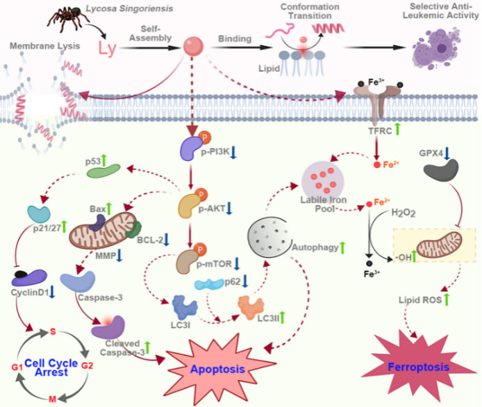 动物毒液是极具特色的天然产物,蕴藏着多种抗癌肽(Anticancer Peptides, ACPs)。其作用迅速而不易产生耐药性,是研发抗癌药物的重要资源,然而ACPs的系统性作用机制,特别是新的机制仍有待阐明,这对推进其在癌症治疗中的应用具有重要意义。本研究以分离于新疆穴居狼蛛(Lycosa singorensis)毒液中的抗癌肽Lycosin-I为对象,发现其对白血病细胞系和临床分离白血病细胞株具有强作用活性而对正常细胞和实体瘤细胞活性弱,具有较好的选择性抗癌活性。Lycosin-I能够选择性与膜磷脂中的磷脂酰丝氨酸结合,二级结构由无规则卷曲转换为α-螺旋发挥抗白血病活性。进一步研究表明以多模式作用机制发挥抗癌活性:在高浓度下Lycosin-I能够快速诱导白血病细胞系K562细胞膜裂解。在低浓度下Lycosin-I能够下调AKT-PI3K-mTOR信号通路诱导细胞自噬、凋亡、周期阻滞和铁死亡。(1)通过线粒体凋亡途径激活caspase-3诱发细胞凋亡;(2)上调p21、p27和p53导致Cyclin D1/E1下调引发细胞周期阻滞;(3)增加转铁蛋白的表达,提高细胞内Fe2+水平,降低GPX4的表达,导致铁稳态破坏和脂质过氧化诱发铁凋亡;(4)上调LC3-II/LC3-I并且下调p62诱导细胞自噬,自噬增加又进一步增强了细胞凋亡和铁死亡。体内实验表明Lycosin-I能够显著抑制K562肿瘤体积且无明显毒副作用。本研究首次发现ACPs可诱导肿瘤细胞铁死亡,极大加深了对ACPs的作用机制的认识;同时Lycosin-I的多模式作用机制可有效的应对白血病治疗中的耐药性问题,因而可作为一个用于白血病治疗的药物先导分子,具有重要开发价值。