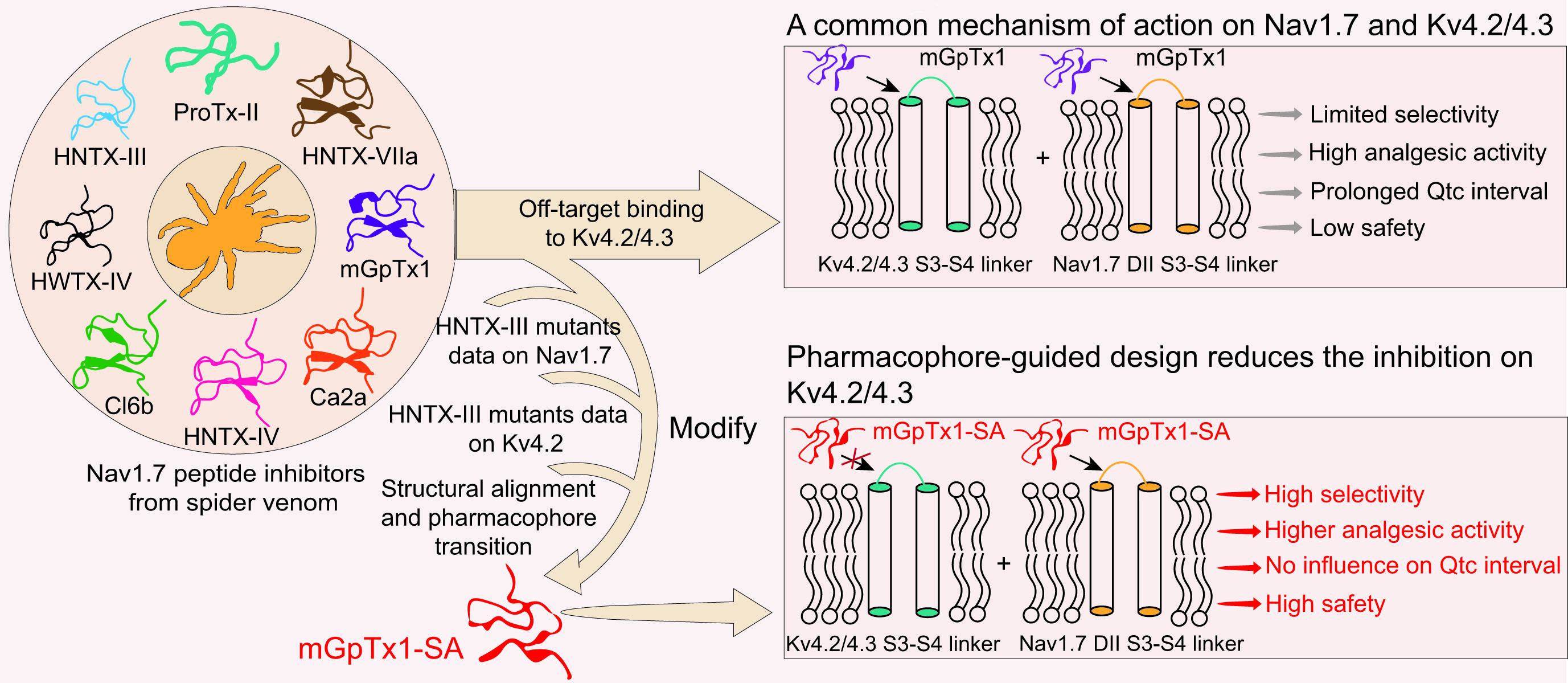 作者首次对蜘蛛毒液来源的Nav1.7多肽抑制剂进行大规模的筛选和验证,发现它们均对电压门控钾通道Kv4.2和Kv4.3(Kv4.2/4.3)有强的抑制活性,系统阐明Kv4.2/4.3是蜘蛛来源的Nav1.7多肽抑制剂产生心脏毒性的脱靶靶点;分子机制研究发现蜘蛛来源的Nav1.7多肽抑制剂脱靶Kv4.2/4.3的共性机制,即保守的药效团和通道上保守的多肽结合位点;基于药效团指导的药物设计,创新性开发了Nav1.7多肽抑制剂设计方法,通过结构类比和嫁接技术,改造获得去除了脱靶活性、高选择性的Nav1.7抑制剂改造体;改造体在慢性炎性和和神经性疼痛动物模型中具有强的镇痛效果,而且具有良好的安全性,无心脏、运动、平衡等毒性。综上,该研究阐明了蜘蛛毒液来源的Nav1.7抑制剂脱靶Kv4.2/4.3产生心脏毒性的分子机制,为研发高效安全的新型Nav1.7镇痛药物提供策略和先导分子。