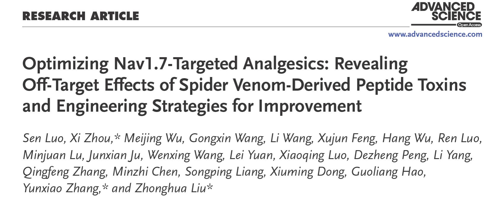 2024年9月9日,动物多肽药物创制国家地方联合工程实验室周熙课题组在Advanced Science(一区TOP,IF=14.3)杂志在线发表了题为Optimizing Nav1.7-Targeted Analgesics: Revealing Off-Target Effects of Spider Venom-derived Peptide Toxins and Engineering Strategies for Improvement的研究论文,开发了一个高效、安全的新型Nav1.7镇痛药物先导分子。