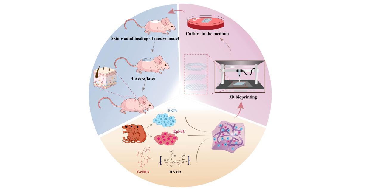 本研究创新性地采用3D生物打印技术,将皮肤源性前体细胞(SKPs)和表皮干细胞(Epi-SCs)精准植入GelMA/HAMA多模态响应型水凝胶中,成功构建出高精度人造皮肤。通过系统优化,确定5% GelMA-0.5% HAMA的最佳配比,该水凝胶体系展现出优异的溶解性、可控的溶胀率、良好的可打印性和理想的机械性能。深入的细胞学研究表明,该人造皮肤不仅能有效维持SKPs和Epi-SCs的细胞特性,还可显著上调SKPs中干性基因和毛囊诱导再生基因的表达水平。动物实验证实,移植4周后创面完全愈合,再生皮肤不仅重建了完整的表皮-真皮结构,还成功再生了毛囊、皮脂腺和血管结构,其组织结构与正常皮肤高度相似。更为让人兴奋的是,该人工皮肤在体外培养12小时后仍保持完整的功能性再生能力。这一突破性进展为伤口愈合、毛囊再生和含细胞人工皮肤的预制提供了创新性解决方案,同时为大规模伤口修复和附属器官再生领域开辟了新途径。此外,本研究建立的含细胞人工皮肤体外培养体系,为后续研究奠定了重要基础,具有很好的应用价值。