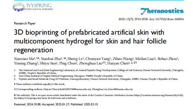 近日,公司动物多肽药物创制国家地方联合工程实验室陈海燕副教授课题组在期刊《Theranostics》(中科院一区Top,IF=12.4)上发表题为“3D bioprinting of prefabricated artificial skin with multicomponent hydrogel for skin and hair follicle regeneration”的研究文章。本研究聚焦于开发多模态响应型水凝胶支架,结合空间可控的3D生物打印技术,旨在构建具有细胞外基质拓扑特征及动态生化信号释放的仿生微环境,为实现皮肤全层结构及其毛囊、汗腺等附属器官的功能性再生提供创新解决方案。
