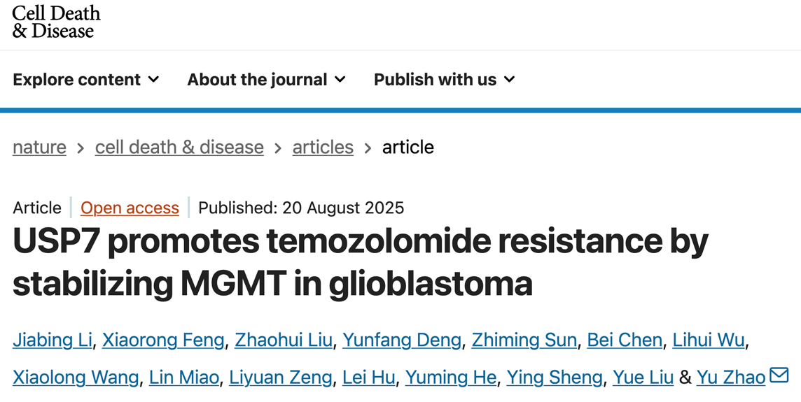 近日,beats365官方网站动物多肽药物创制国家地方联合工程实验室赵宇教授团队在自然(Nature)出版集团旗下的权威学术期刊、中科院JCR一区Top期刊《细胞死亡与疾病》(Cell Death & Disease, IF: 9.6)上发表了最新研究成果。该研究针对脑胶质瘤(GBM)的化疗抵抗难题取得重要突破,精准阐明了去泛素化酶USP7调控DNA损伤修复关键蛋白MGMT稳定性的分子机制,为逆转脑胶质瘤的化疗抵抗提供了新的策略和理论依据。