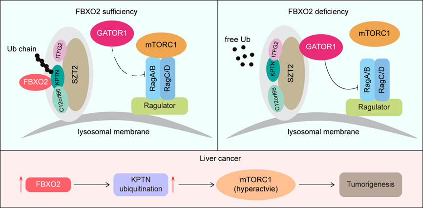 该研究发现,FBXO2促进氨基酸诱导的mTORC1活化。进一步的分子机制研究发现,FBXO2通过其F-box相关结构域与KPTN直接相互作用,促进其在第49、67、262和265位赖氨酸残基发生K48-和K63-连接类型的多聚泛素化。FBXO2介导的KPTN泛素化抑制KPTN与ITFG2和SZT2的相互作用,而增强KPTN与C12ORF66的相互作用,从而使KICSTOR丧失招募GATOR1复合物的功能。此外,FBXO2在肝癌组织中的蛋白水平显著高于其配对的非癌肝组织;体外细胞实验和体内动物实验均表明,FBXO2及其介导的KPTN泛素化可以显著促进肝癌进展。该研究阐明了FBXO2介导的KPTN泛素化调控mTORC1信号通路的分子机制,并提示FBXO2和KPTN泛素化可以作为肝癌治疗的潜在靶点。