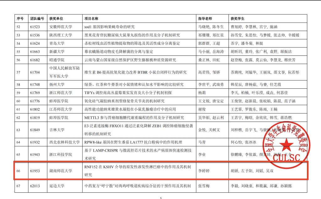 其中公司李婷婷教授指导的全国老员工生命科学竞赛(探究类)项目荣获国赛一等奖,获奖项目名称为RNF152在KSHV 介导的原发性渗发性淋巴癌中的作用及其机制研究。获奖同学有胡娇、左予阳、刘韬、吴双四位同学。