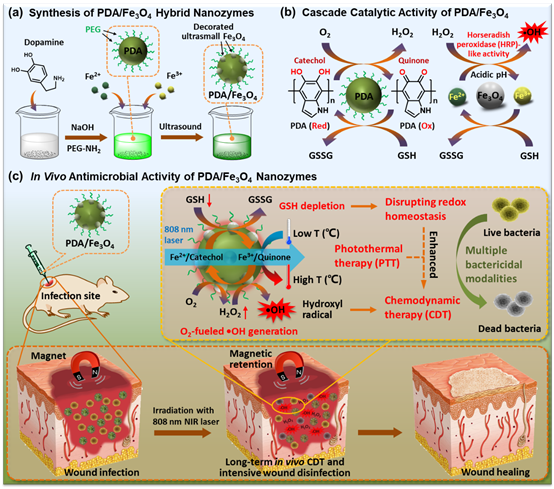 病原性细菌感染,主要包括化脓性伤口感染和败血症,是严重威胁人类健康的常见疾病。对抗细菌感染的传统策略是使用抗生素药物,但是抗生素的滥用导致了耐药细菌的产生,这对未来抗生素的使用造成了重大威胁。作为传统抗生素治疗的潜在替代手段,利用类芬顿反应分解过氧化氢(H2O2)产生羟基自由基(•OH)的化学动力学疗法(CDT),由于其独特的氧化抗菌性能和几乎可以忽略的耐药性,已经引起了极大的关注。然而,氧化还原稳态作为细胞的一种固有防御机制,通过维持氧化剂(H2O2)和抗氧化剂(GSH)的平衡,严重限制了CDT介导的抗菌治疗。因此,合理设计能够打破细胞氧化还原稳态的多功能纳米平台具有重要意义。更重要的是,现有的纳米抗菌药物在治疗过程中不能有效的保留在感染部位,而是不可避免地扩散到其他正常组织和器官,这不仅降低了CDT的治疗效果,对正常组织和器官也造成不良的副作用。