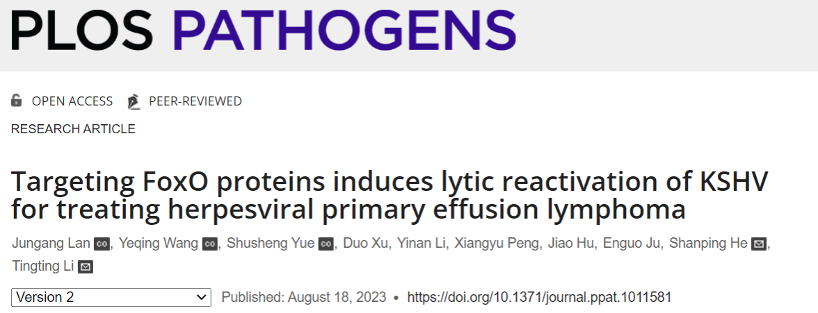 卡波氏肉瘤相关疱疹病毒(Kaposi’s sarcoma-associated herpesvirus,KSHV)是一种人类致癌病毒,其生命周期包含潜伏期和裂解期。原发性渗出性淋巴瘤 (Primary effusion lymphoma,PEL)是由KSHV潜伏感染的侵袭性B细胞系淋巴瘤。KSHV在大部分PEL细胞中始终保持潜伏状态,这对KSHV诱导的相关肿瘤的治疗构成了极大威胁。
