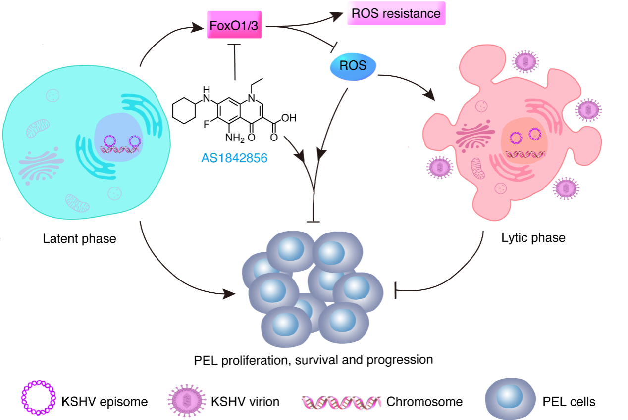 综上所述,抑制FoxO1或FoxO3蛋白能显著增加细胞内ROS水平,从而诱导KSHV进入裂解复制期,并最终抑制PEL的发生发展,这为PEL肿瘤的治疗提供了新靶标、新策略和新思路。此外,该研究成果有望进一步扩展到其他病毒相关疾病的治疗。