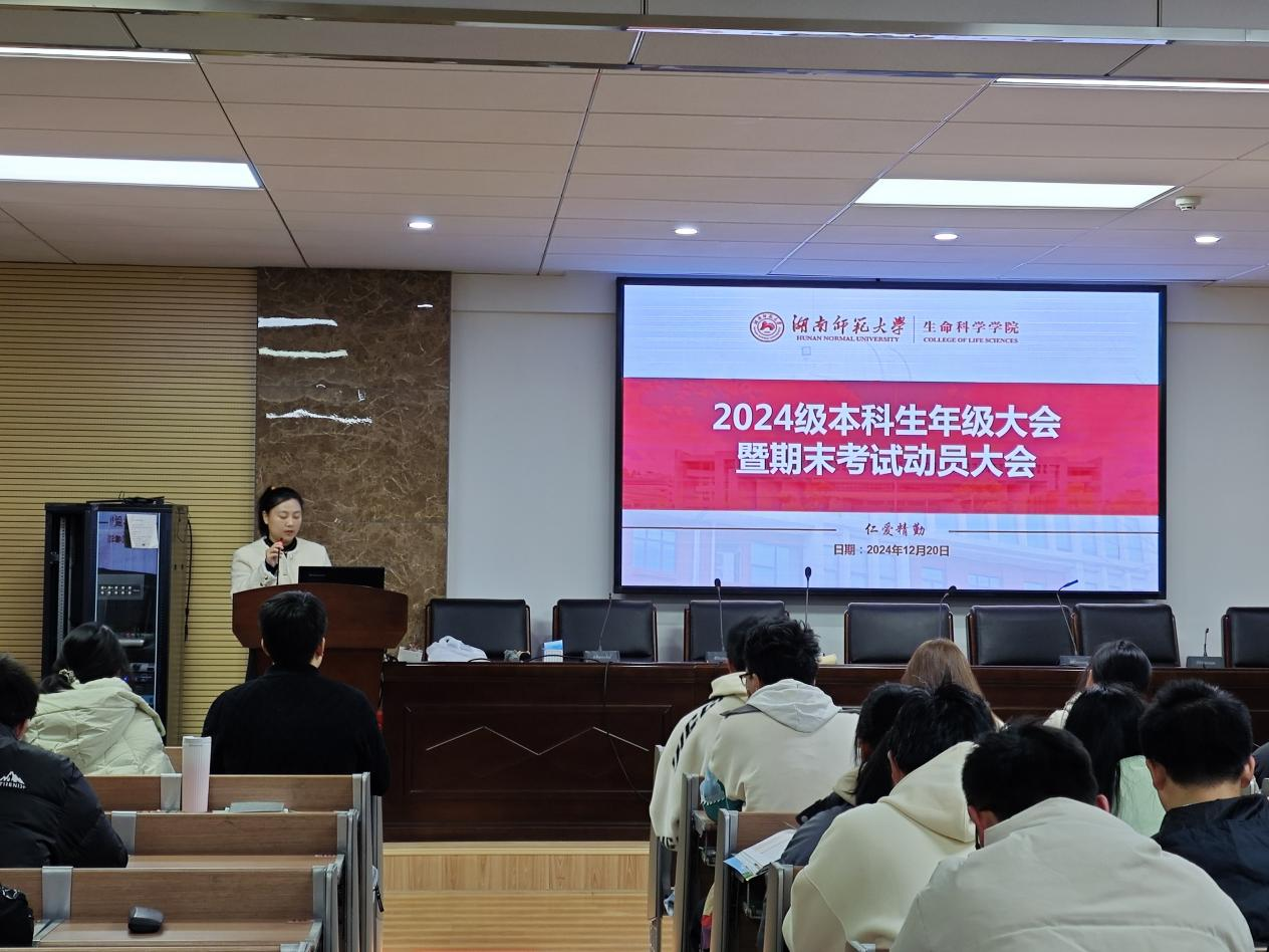 (通讯员 喻雪 吴德高)12月20日中午,beats365官方网站2024级辅导员罗静伟老师在生科院三号楼B307报告厅召开2024级本科生年级大会暨期末考试动员大会,生科院24级全体同学参加此次会议。