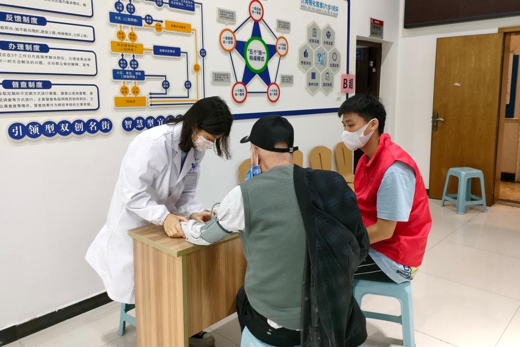 志愿者协助工作人员测量血压