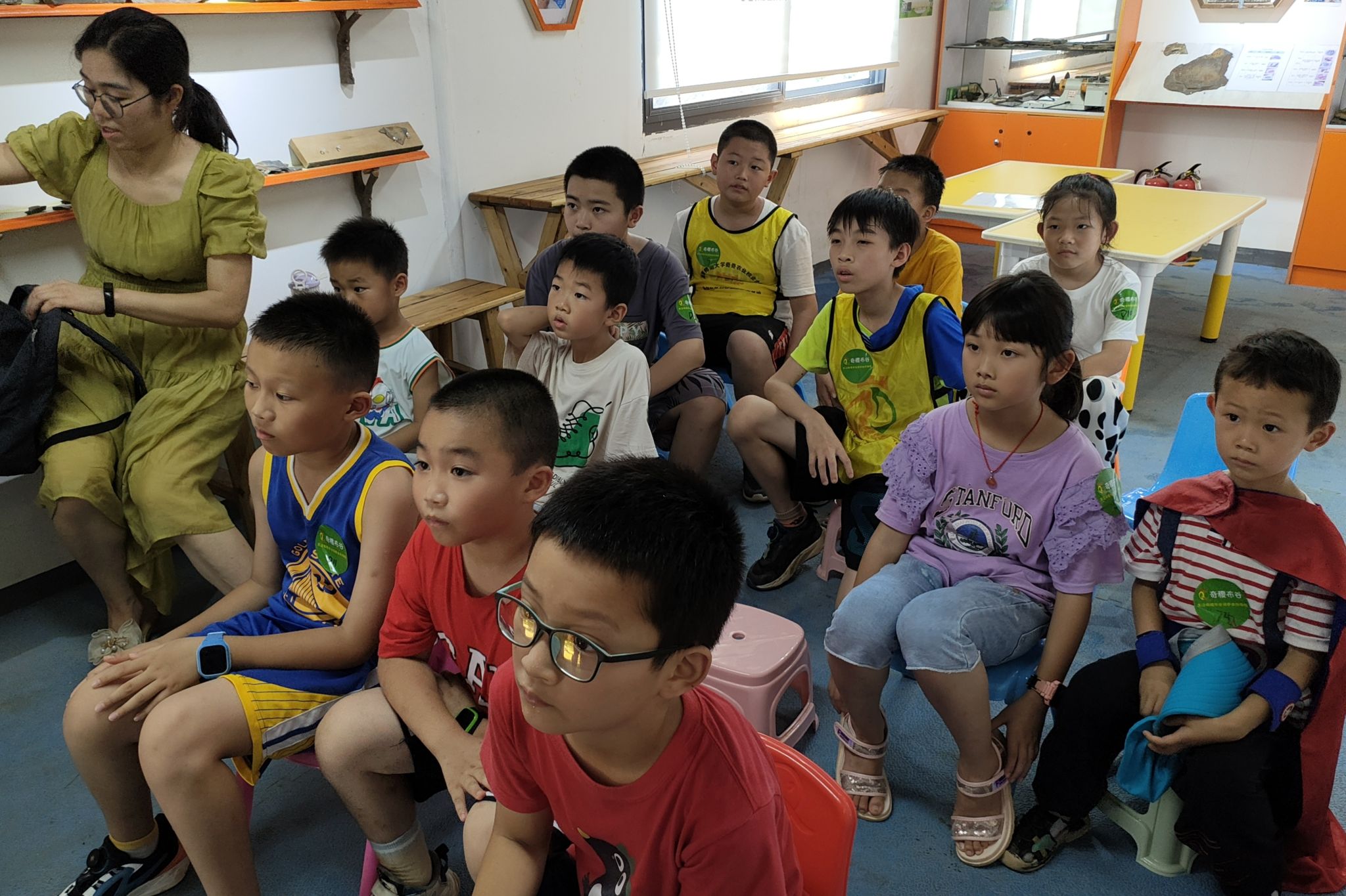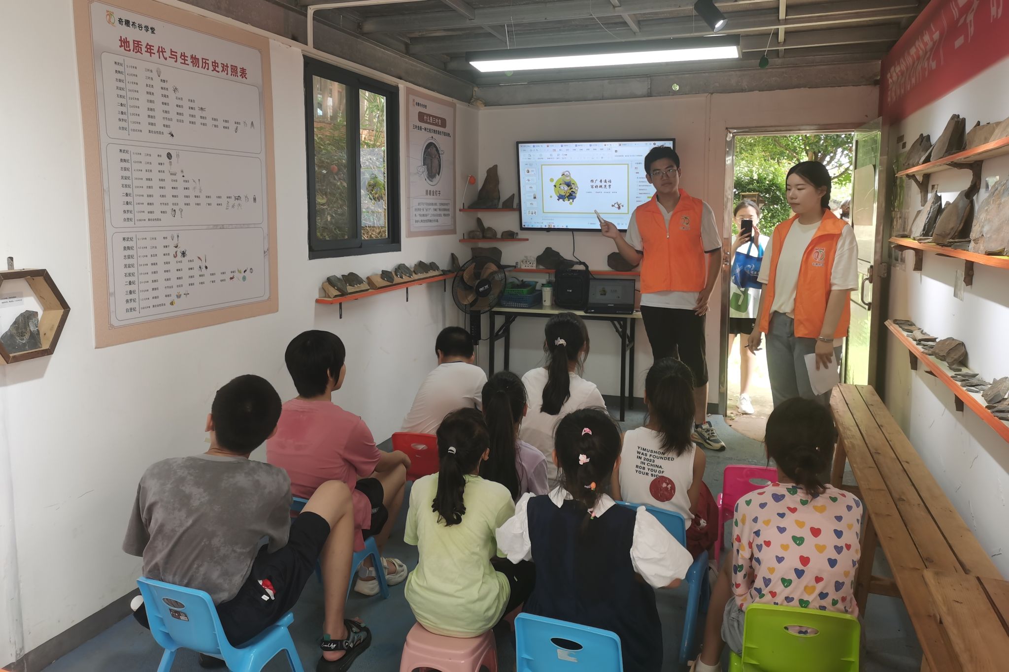 同时,成员们于奇稷布谷化石馆举办“推广普通话 写好规范字”宣讲会,主要面向当地小员工进行针对性科普。黄少彬简述了此次宣讲会奖惩规则,并介绍此次宣讲会主要内容。他从与普通话相关的小故事入手切入主题,带领员工们思考“推广普通话 写好规范字”的意义。随后,黄少彬为员工们介绍普通话相关法律法规,进行绕口令小游戏并给予表现优秀的员工奖励。