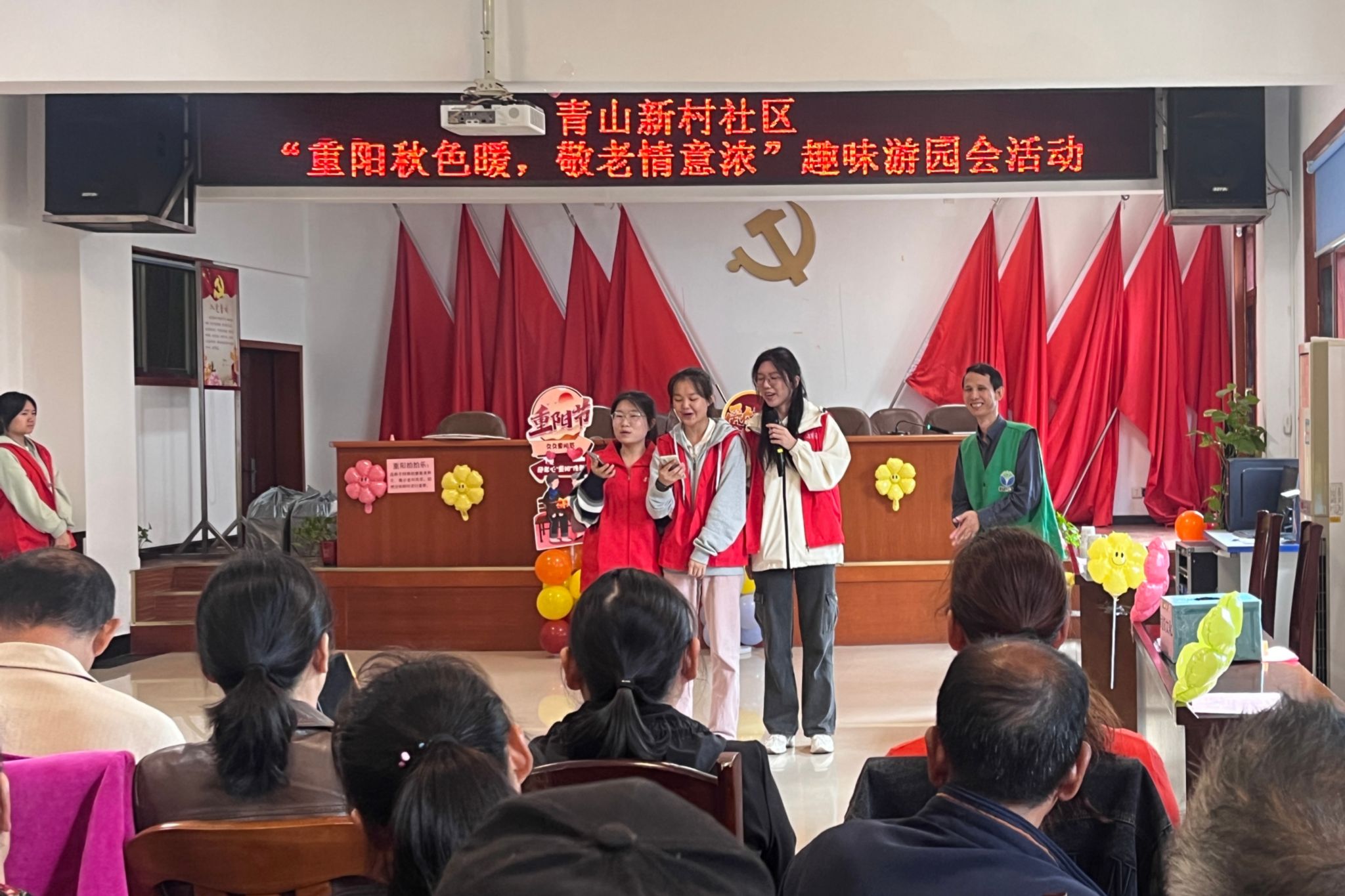 此次活动分为表演节目、进行游戏和赠送礼物三部分。志愿者们提前到达社区进行场地布置。志愿者们为老人带来朗诵《九九重阳》、歌曲《夕阳红》和舞蹈《重阳佳节》,与老人一同感受文字的力量和艺术的美好。同时,志愿者们组织了“猜字谜”和“翻纸牌”游戏,老人们积极参与,脑力和反应能力均得到锻炼,增进了老人们之间的交流和友谊。志愿者们为老人赠送礼物,并合影留念。