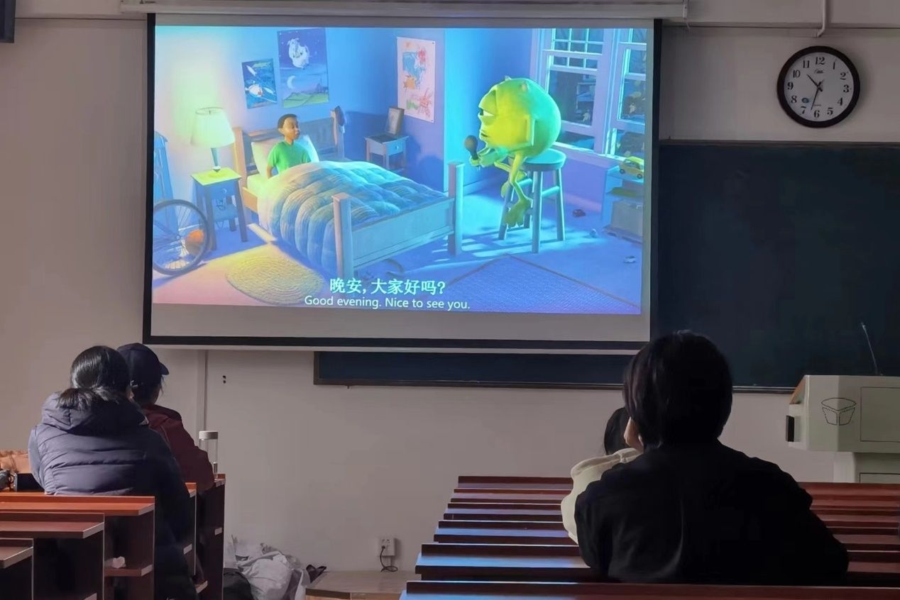 主持人为大家介绍观影的注意事项,提醒同学们在观影过程中保持安静,勿随意走动,以防影响他人观影。同时,他说明影片《怪兽电力公司》主要讲述的是一个人类小孩误闯以惊吓为电力能源的奇幻怪兽公司,在公司中收获了一份友情并将惊吓公司变为笑声公司的故事。该影片让同学们意识到在成长历程中勇气与友情的重要性。为增强同学们的体验感与参与感,主持人组织大家进行心理趣味游戏"数字炸弹",并为获胜的同学颁发奖品。