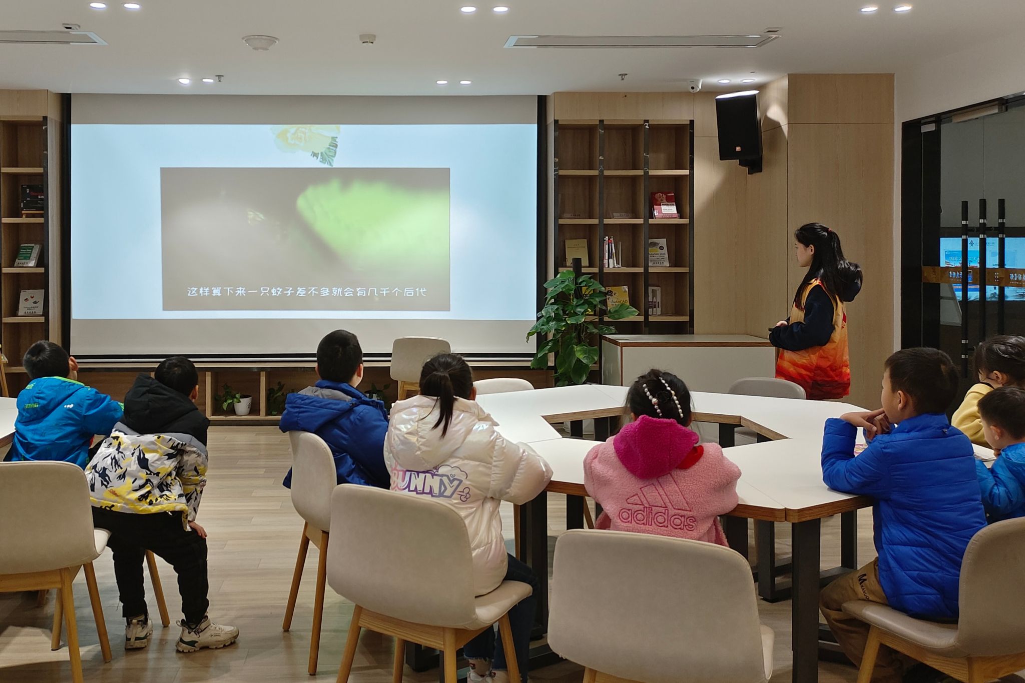 此次活动分为知识讲解和游戏问答两个部分。志愿者们引导小朋友和家长排队签到入座,维持活动场馆秩序。主讲人结合文字和视频给小朋友讲解有关蚊子的知识,通过展示蚊子模型向他们介绍其身体结构,并以提问的形式与小朋友们互动。她讲述冬天蚊子一般躲藏在地下室、地下车库、防空洞、仓库等光线昏暗的地方,库蚊、间蚊等少数蚊子需要在水中产卵和孵化幼虫而在水中度过冬季。主讲人介绍蚊子通过筋肉运动产生热量保持体温,同时,冬天蚊子会进入滞育阶段。小朋友们举手提问与主讲人互动,分享日常生活中观察到的蚊子生活习性。志愿者们设计知识抢答游戏环节,加深小朋友们对蚊子相关知识的印象,并向回答问题的小朋友分发礼物。