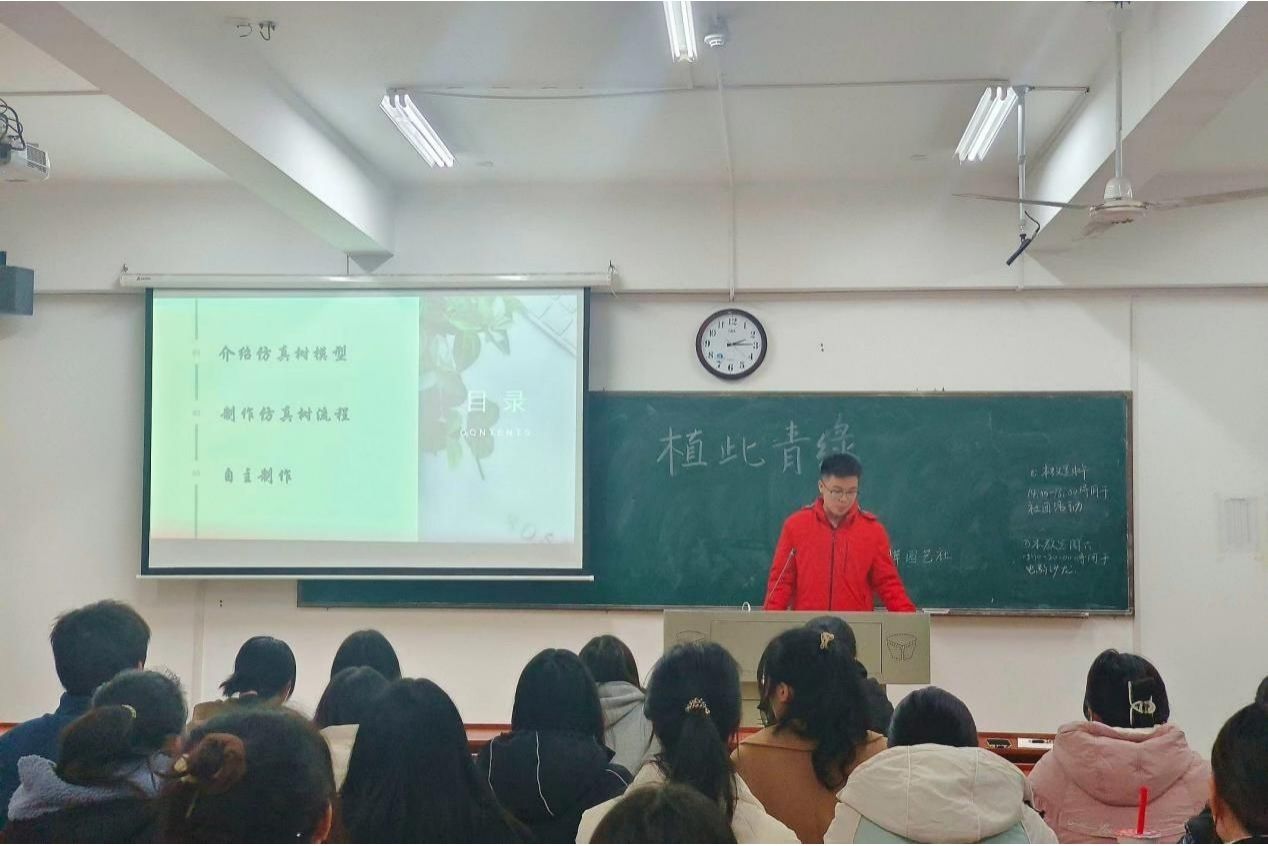 社团理事提前到达活动场地布置,为会员们准备活动所需的仿真树相关制作材料。主讲人通过图文结合的方式讲解仿真树模型的结构特征,表示仿真树是依据对应树种的实际特征制作,并进行相应比例的缩小形成的。此外,主讲人还介绍了制作仿真树的流程和方法,提醒会员们在制作过程中按照仿真树的相关结构特征,按照结构从上到下的顺序进行制作。随后,项目组成员为会员们分发仿真树的制作材料,会员们依据制作流程进行仿真树的制作。