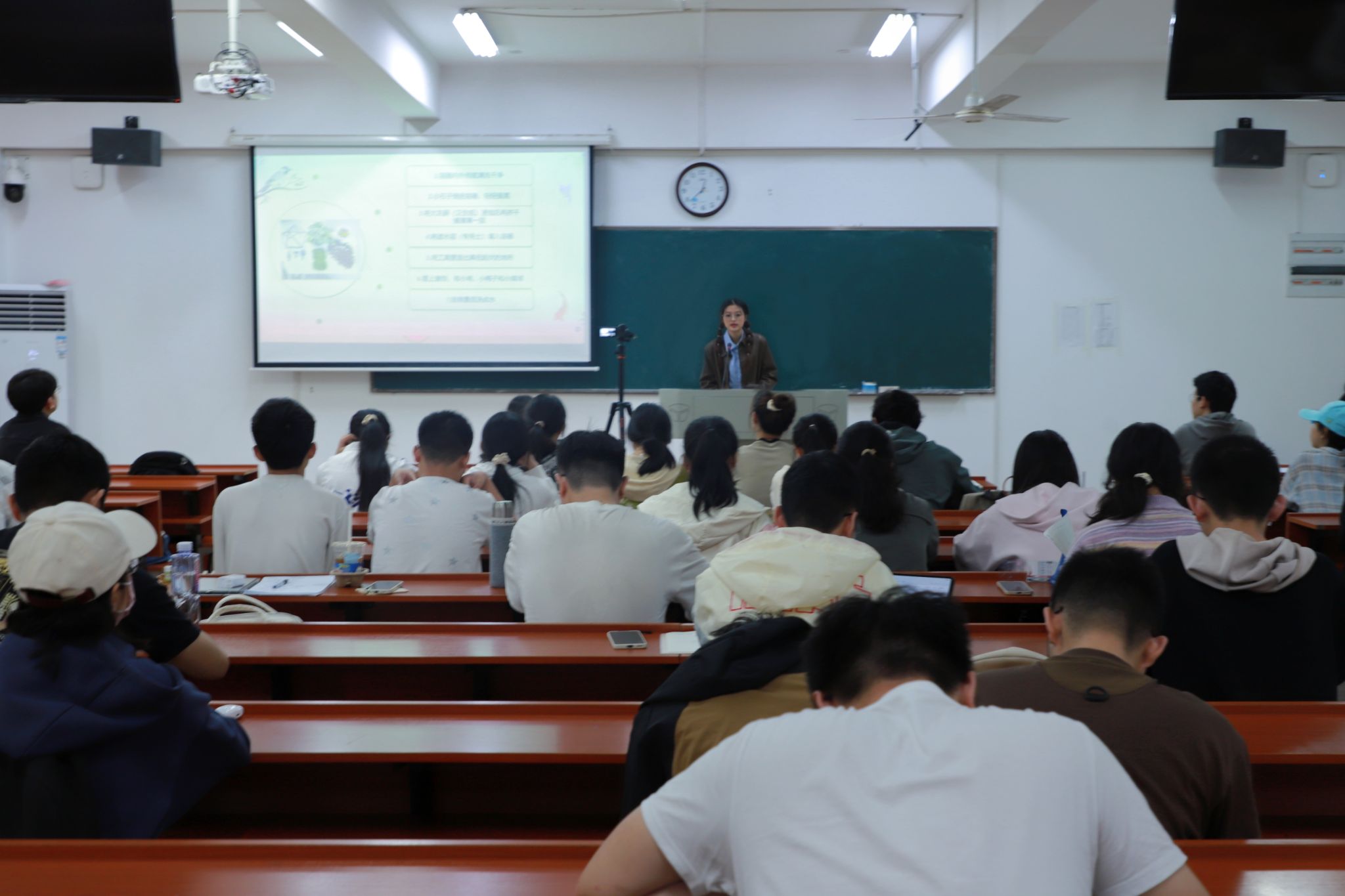 此次活动由生态知识科普、生态瓶制作和成品展示三个部分组成。主讲人借助PPT为同学们讲解生态系统的基本种类、作用和功能,她解释生态系统可分为森林、草原和城市生态系统等,具有可持续性、自我调节和开放等特征。随后,主讲人向同学们介绍生态瓶的基本原理,即在瓶中构建一个小的生态系统。她通过播放视频的形式分享生态瓶的制作步骤,讲解生态瓶制作时需准备苔藓、沙土和玻璃瓶等材料,放置各种材料时应由下至上依次放置,并盖好瓶盖密封。同时,主讲人提醒同学们制作生态瓶需先将瓶内清洗,防止微生物破坏生态平衡。此外,她说明生态瓶可用作宿舍装饰,还可作为礼物赠送他人,并向同学们展示部分成品,分享其创作理念。