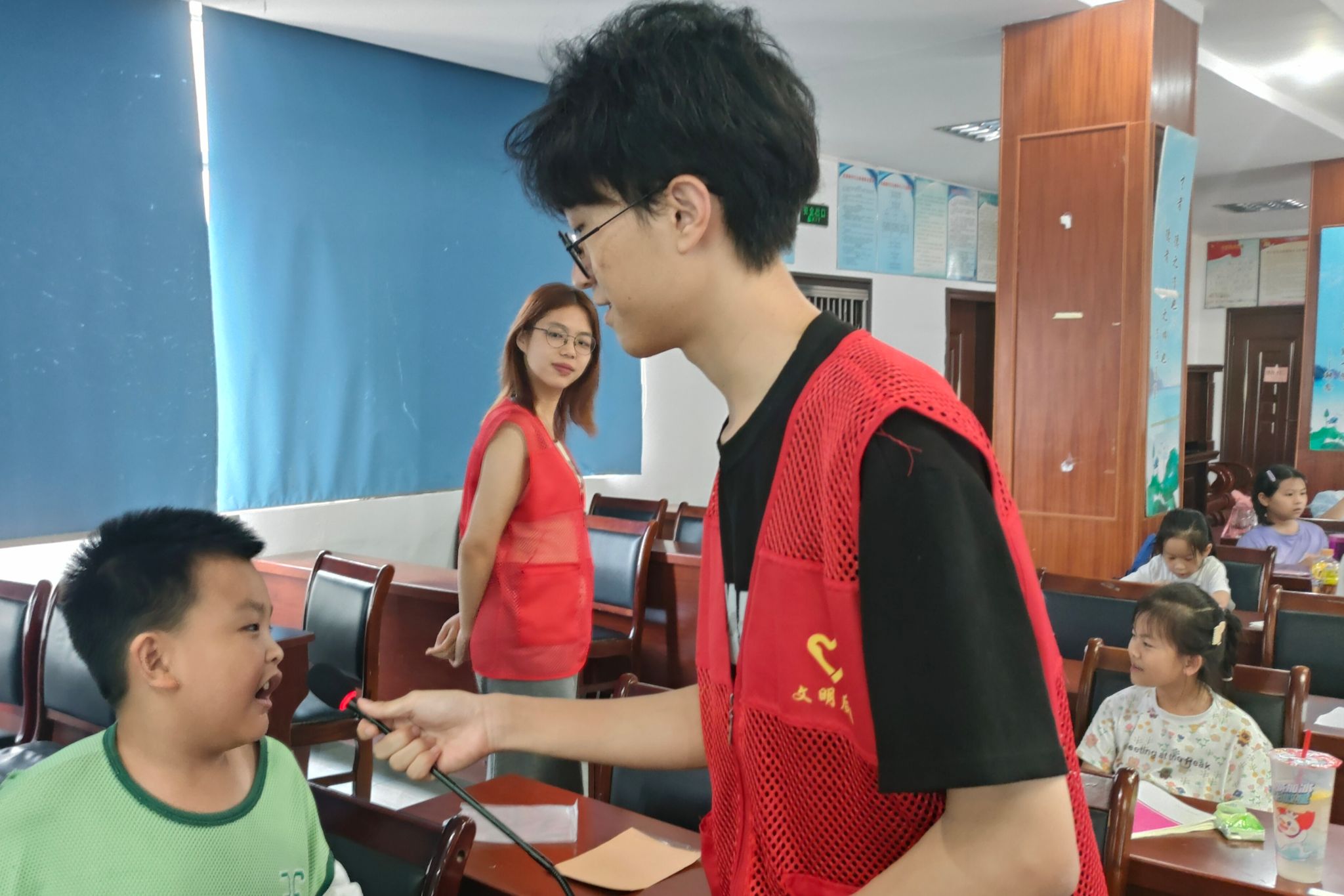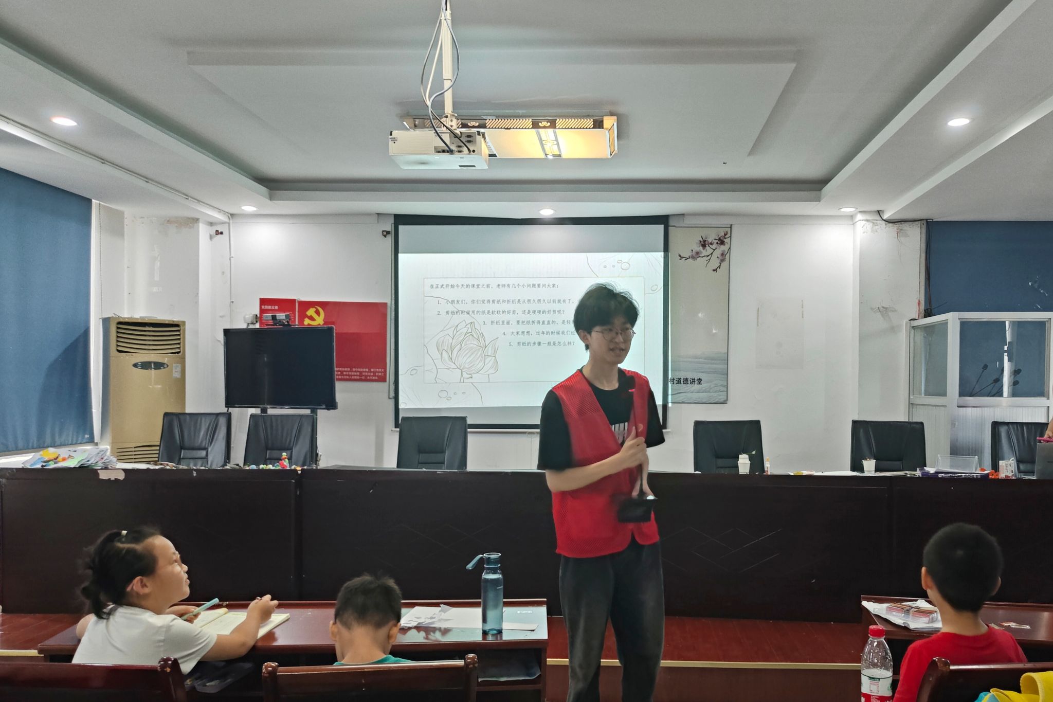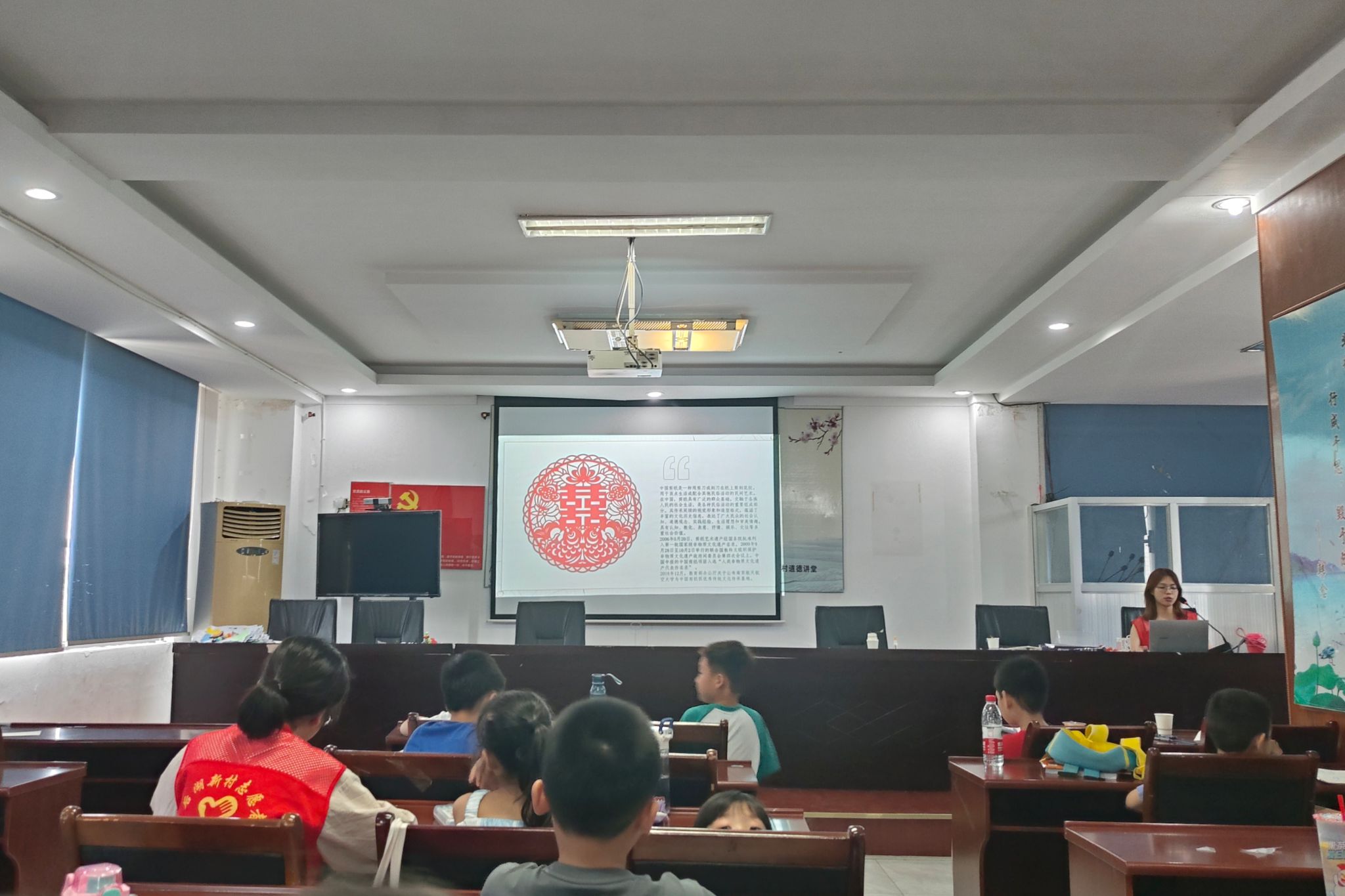 肖彬向小朋友介绍剪纸的历史背景、艺术特点,并播放剪纸教学视频,让小朋友体会剪纸背后的文化底蕴。在主讲人的指导下,小朋友们认真学习折纸、刻画、镂空等剪纸的基本技巧。陈贤设置提问抢答环节,提出“剪纸出现的朝代”、“剪纸适用的纸质”等问题,帮助小朋友记忆和掌握剪纸的相关知识。肖彬带领小朋友们运用所学技巧,将手中的剪纸折成所需形状并画上图案。为了确保小朋友们的安全,剪纸统一交给团队成员裁剪,由团队成员在裁剪完成后依次发放。小朋友们和主讲人一起投入到创意剪纸的制作过程,并收获各种各样的剪纸作品。