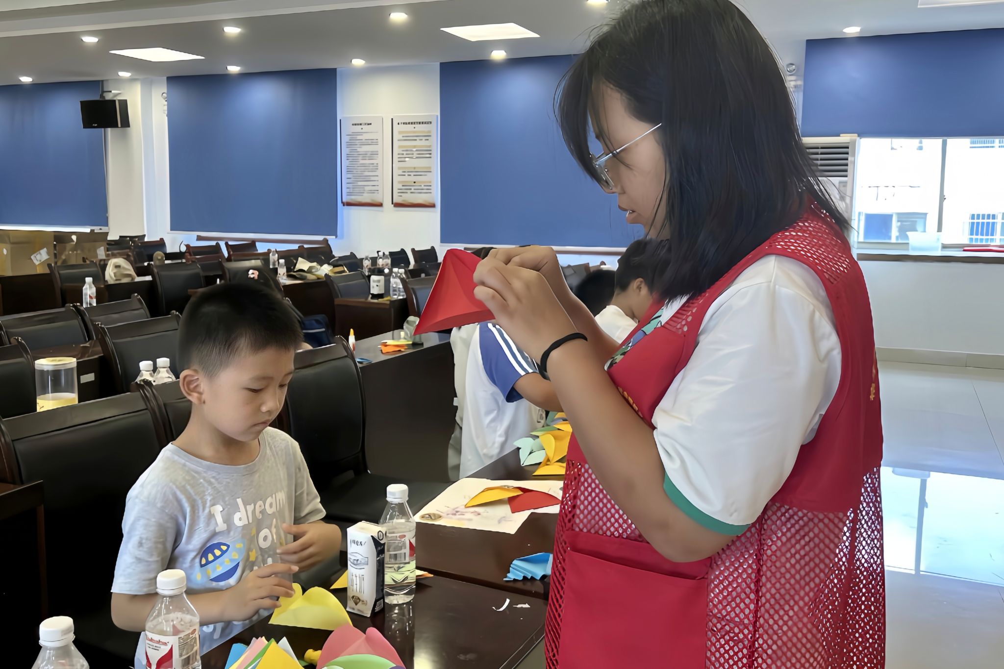 顾鑫悦结合视频帮助小朋友了解折纸绣球的制作步骤,她为小朋友分发折纸,演示纸张折叠与粘黏的方法。同时,顾鑫悦提醒他们注意挤用的胶水量,避免胶水粘手。实践队队员帮助小朋友进行折叠、穿绳,制作完成后小朋友互相展示成品。