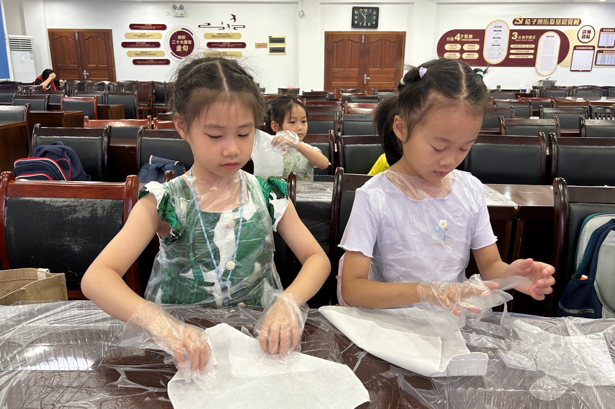 李宇璇向小朋友介绍中国民间传统染色工艺——扎染,她解释扎染古称扎缬、绞缬,是织物在染色时部分结扎起来使之不能着色的一种染色方法。随后,李宇璇说明扎染工艺分为扎结和染色两部分,通过纱、线、绳等工具,对织物进行扎、缝、夹等多种形式组合后放入染缸进行染色。小朋友们领取材料,扎结后利用不同颜色的染料进行染色,并装入塑料袋中密封保存。