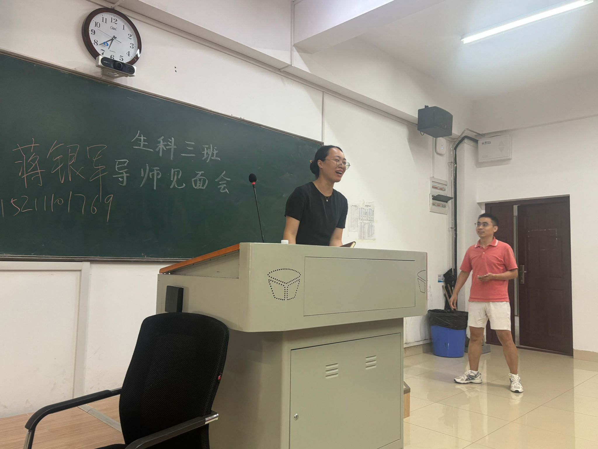 班导师蒋银军、禹琪芳面带微笑地向生科三班的同学们进行自我介绍,并讲述了自己的研究方向与办公地点等,同时鼓励迷茫中的同学们大胆尝试。三班同学则依次自我介绍,包括兴趣爱好及对未来的期待。现场气氛活跃,和乐融融。