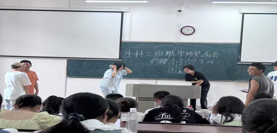 生科二班班导师刘吉简单自我介绍,并对同学们提出的如考研等一系列问题进行了解答,让同学们对老员工活有了初步的了解。随后,全体成员进行小游戏,加强班级文化建设。