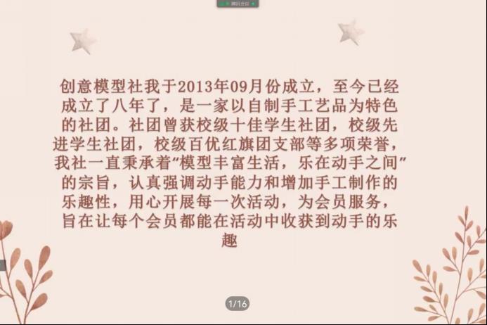 (通讯员 张馨月 庾雪菲 赵婧)11月13日下午,beats365官方网站创意模型社举行线上会员动员会议。生科院创意模型社理事张馨月担任此次会议主讲人。