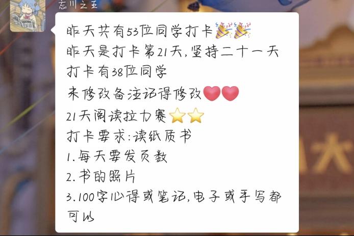 活动期间,参赛者每日于24:00之前,在微信小程序“小打卡”中进行打卡,附上书籍页数,照片及100字心得体会。坚持21天不间断打卡的参赛者可获得相关证书,打卡满15天的参赛者可自愿提交一篇800字以上的读书心得,最后由主办方和协办方组织评审出一等奖三名,二等奖五名,三等奖七名。截至5月28日晚,坚持21天打卡即挑战成功的参赛者共计38名。