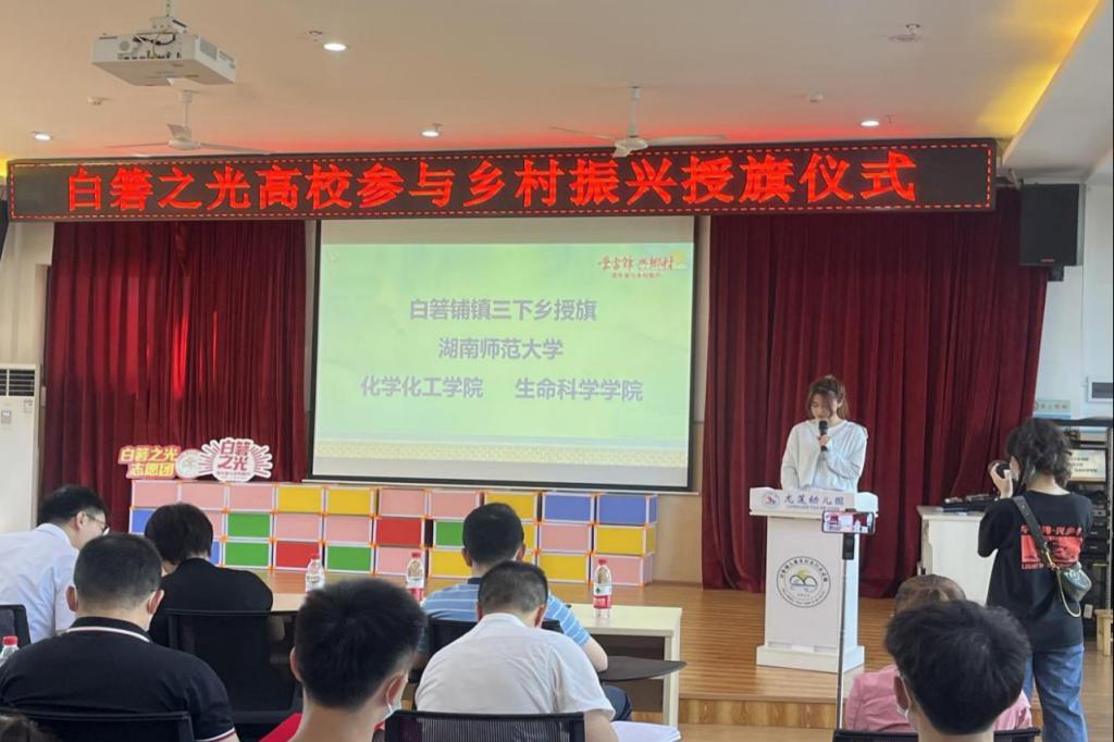 白箬铺镇镇长党委书记胡宇波向生科院“青春下乡”暑期实践团队进行授旗并表达热烈欢迎与美好祝愿。