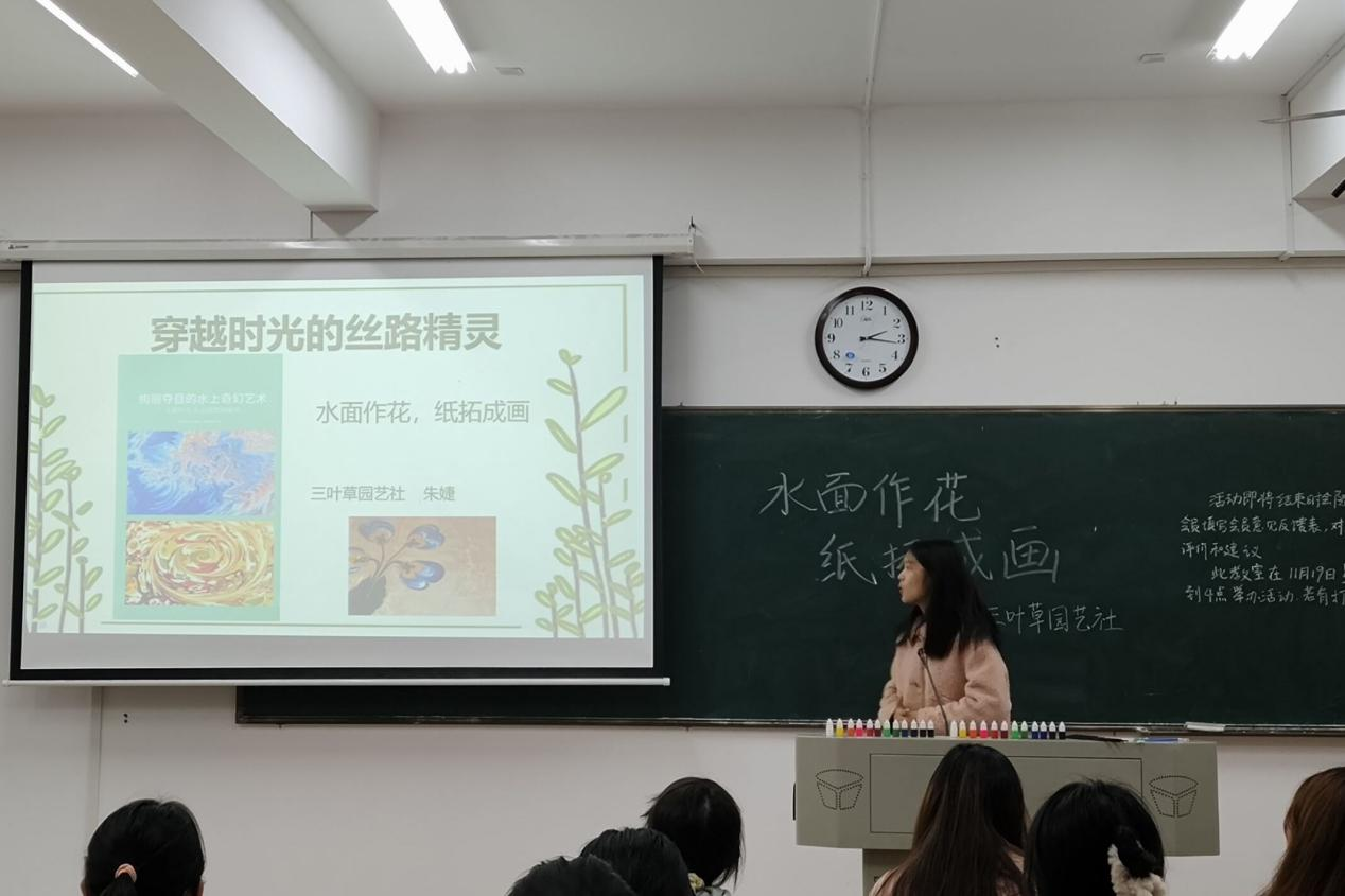 (通讯员 伍鼎载 谭莎莎)11月19日下午,beats365官方网站三叶草园艺社于生科院B108教室举办“水面作花,纸拓成画”手工活动。生科院三叶草园艺社理事朱婕担任此次活动主讲人。