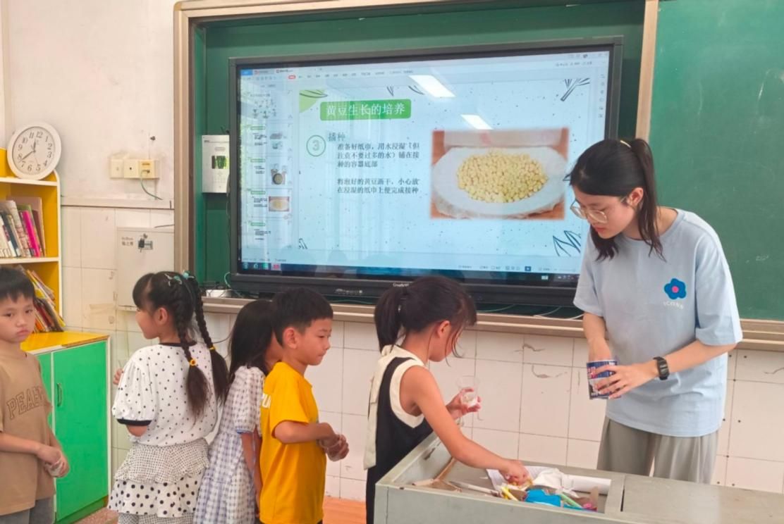 此次课程由老师讲解黄豆水培原理、员工动手实践以及老师验收成果三个部分组成。孙亚茹带领同学们认识黄豆,初步了解黄豆的生长环境与生长条件。同学们领取黄豆种子,对黄豆种子进行挑选,将发颜色不健康的、不成形的黄豆种子筛选出来。同学们在老师的指导下按照种植步骤制作培养瓶,在培养瓶底部铺一层湿纸巾,将适量的黄豆放入培养瓶中,将湿纸巾铺到黄豆上。员工进行成果展示,老师布置同学们每日进行黄豆观察日记书写和发芽进程绘画。
