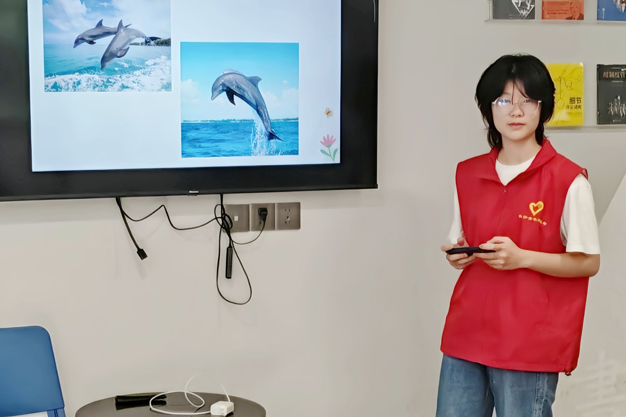 此次活动分为知识科普和游戏问答两个部分。志愿者们引导小朋友排队签到入座,维持活动场馆秩序。主讲人结合文字和视频向小朋友们讲解有关海豚的知识,并以提问的形式与小朋友们互动。她讲述海豚的聪明之处体现在大脑发达、意识团结以及学习能力强三大方面。此外,主讲人分享海豚的远房亲戚——虎鲸,它和海豚一样聪明,但却是海豚的天敌。随后,小朋友们举手提问与主讲人进行互动,分享自己在水族馆、动物园与海豚互动的经历。志愿者们设计知识抢答游戏环节,进一步加深了小朋友们对海豚生物特点、生活习性等知识的印象。