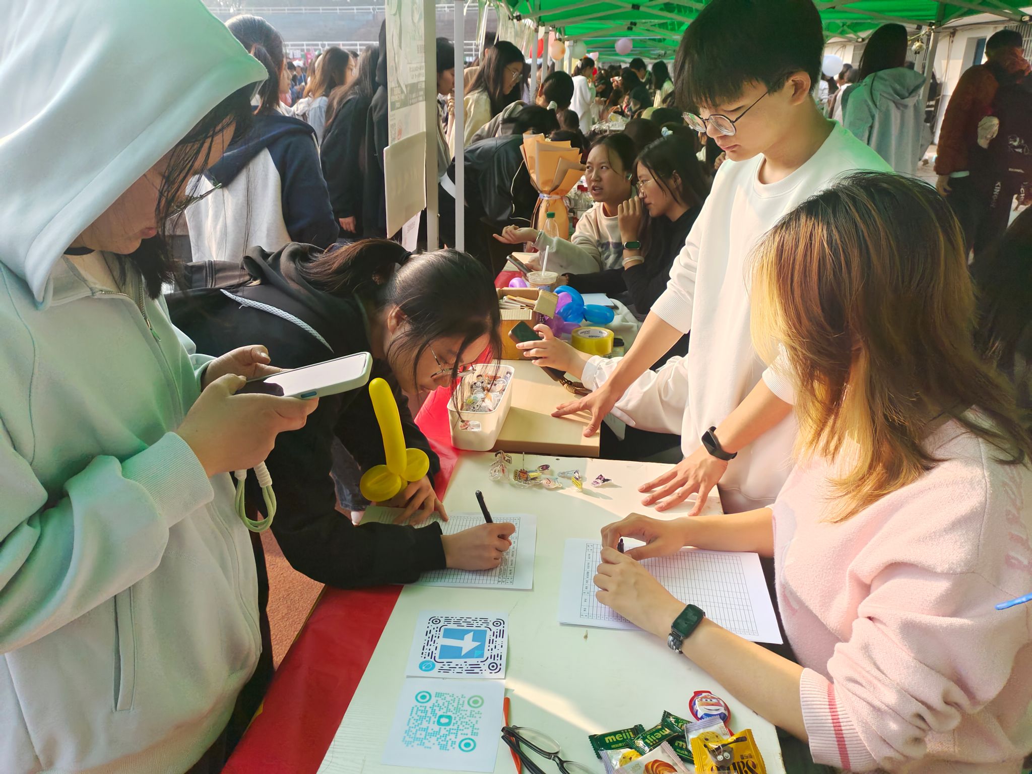 “百团大战”由社团摊位特色活动和舞台节目表演两大部分组成。在舞台环节,各社团带来了精心编排的节目,展现了各自独特的魅力。生科院学社管主任赵琳慧代表公司,与其他公司的学社管主任共同演绎了会歌《青春舞台》,赢得了现场观众的热烈掌声。此外,生科院的五个社团还通过一系列丰富多彩的互动体验活动,吸引了大量同学驻足参与。达人学社的投壶游戏与成语猜谜、暖意生物学社的手工染色卡和折纸星星、三叶草园艺社的套圈游戏和植物印画、科幻动漫协会的舞蹈表演与图画猜词,以及小微公益社的创意扭扭棒制作。活动期间,各社团积极地向来访者介绍社团特色,耐心地解答疑问,极大地促进了社团的招新效果。吴晴和罗静伟两位老师也深入各个摊位,对招新工作提出了宝贵的指导意见,鼓励同学们勇敢追求自己的兴趣爱好,丰富老员工活。