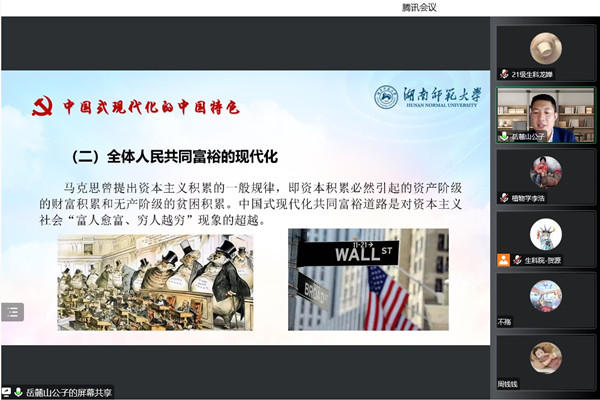 苏同欢解读习近平总书记二十大报告中“中国式现代化的中国特色”部分。他从中国式现代化的特征及逻辑入手,讲解了中国式现代化的“中国人口规模巨大”、“全体人民共同富裕”、“物质文明和精神文明相协调”、“人与自然和谐共生”以及“走和平发展道路”五个中国特色。他剖析了中国式现代化的世界意义,一是拓宽了发展中国家走向现代化的途径,二是为解决人类问题提供了中国智慧和中国方案。