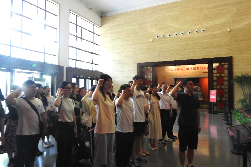 全体党员同志在“长岛人歌动地诗”中国共产党长沙历史陈列展厅前重温入党誓词。由生物与医药专业研究生党支部第一书记周熙老师领誓。