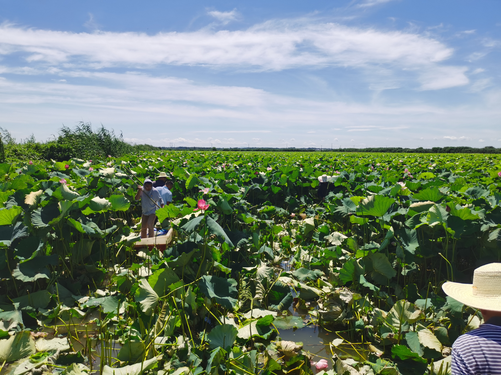 支部党员在“荷鱼共养”生态池塘采摘莲蓬