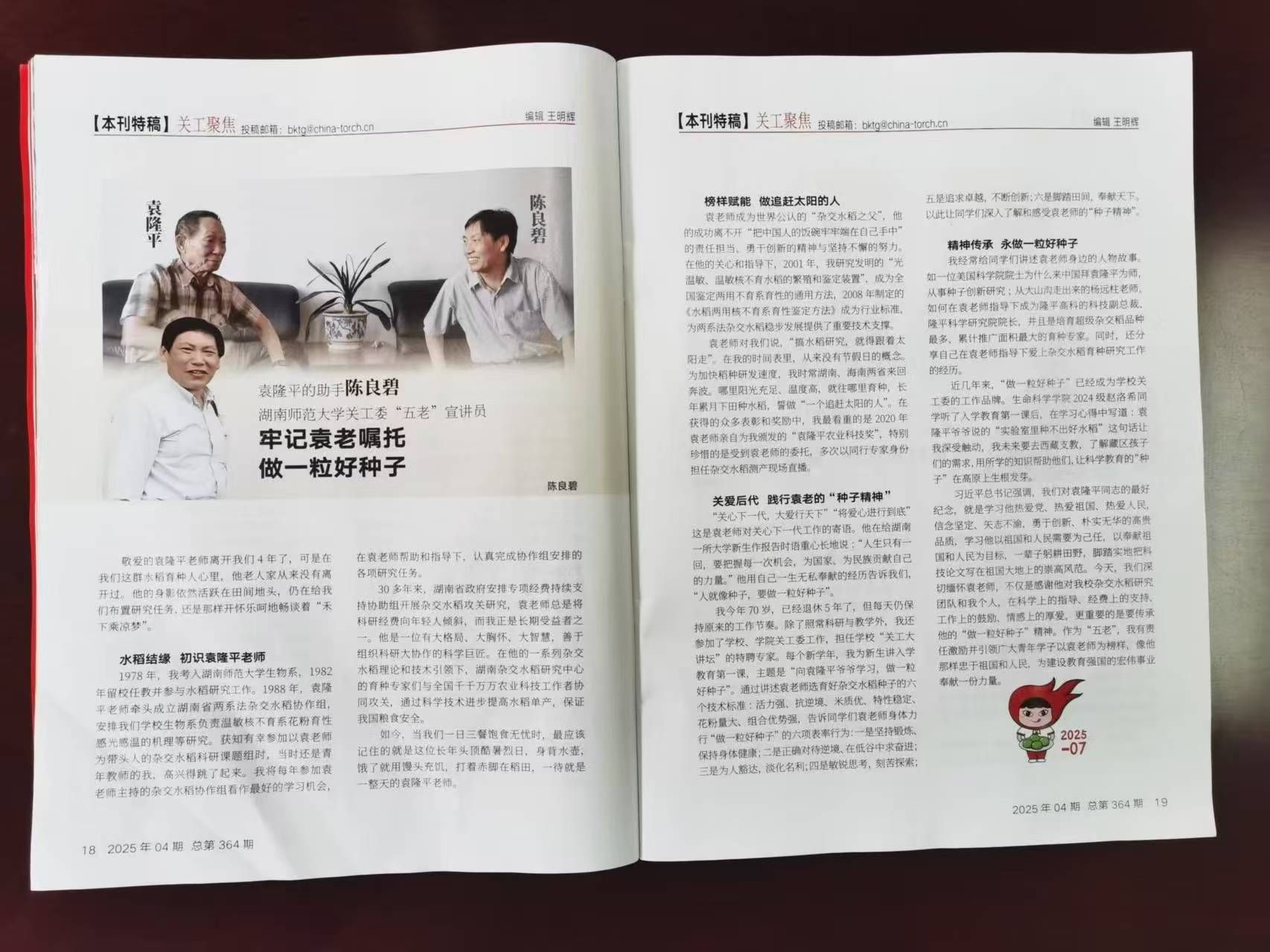 (通讯员 韩淑婷 罗静伟) 近日,中国关工委工作刊物《中国火炬》刊发了公司教授陈良碧题为《牢记袁老嘱托,做一粒好种子》的文章。文章以深情的笔触回顾了陈良碧教授在袁隆平院士的关怀与指导下投身杂交水稻研究的经历,并展现了其数十年如一日践行科学家精神的奋斗历程。