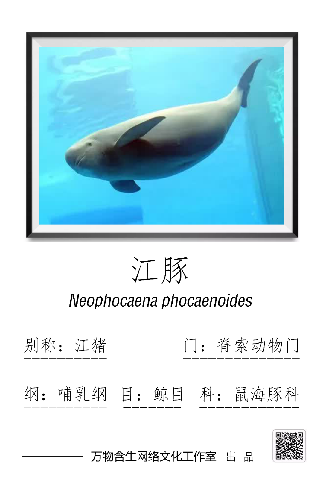 江豚(Neophocaena phocaenoides),俗称江猪,一种小型鲸类,是鼠海豚科江豚属仅有的1种,被誉为长江生态的“活化石”和“水中大熊猫”。列入《世界自然保护联盟濒危物种红色名录》(IUCN) :极危物种(CR)。列入中国《国家重点保护野生动物名录》:一级保护动物。