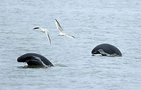 3、习性:江豚喜单独活动,有时也结成2~3只的小群。但也有7~8只在一起的记录。它的性情活泼,常在水中上游下窜,身体不停地翻滚、跳跃、点头、喷水、突然转向等动作。