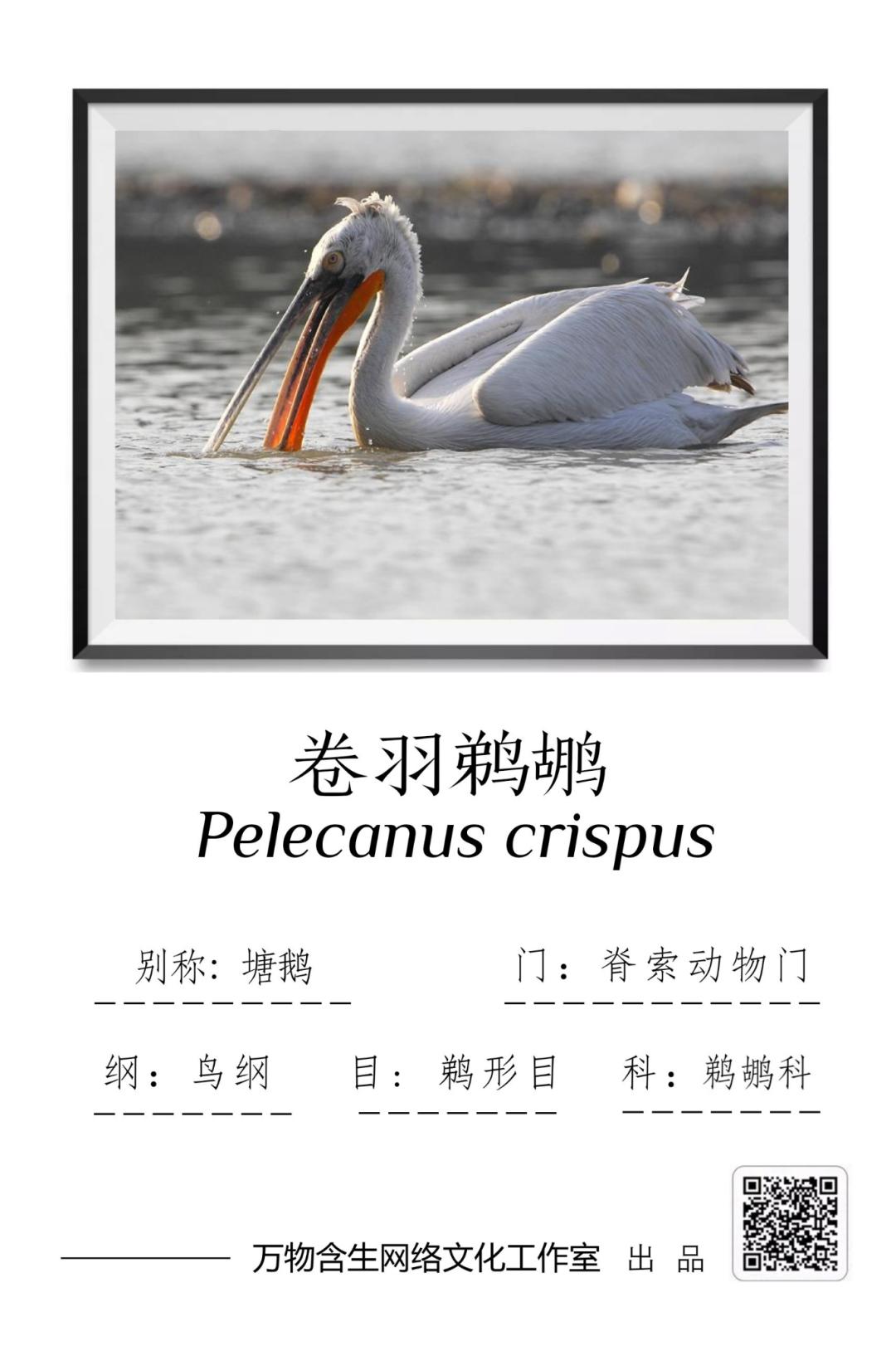 卷羽鹈鹕(Pelecanus crispus)为鹈形目鹈鹕科的鸟类,属大型水禽。又称塘鹅,是国家一级保护动物。列入《世界自然保护联盟濒危物种红色名录》(IUCN),2013年濒危物种红色名录ver3.1——易危(VU);2017年濒危物种红色名录ver3.1——近危(NT)。