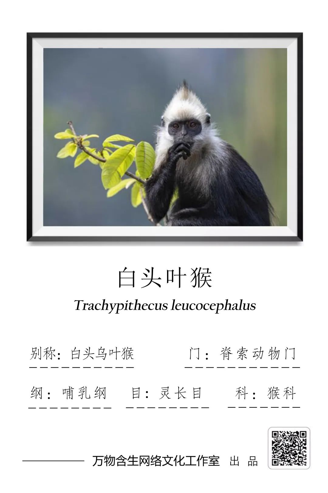 白头叶猴(Trachypithecus leucocephalus)是灵长目猴科叶猴属的猴类,别名白头乌叶猴,是世界濒危、中国特有的国家一级保护野生动物。列入《世界自然保护联盟濒危物种红色名录》(IUCN):极危物种(CR),2015年评估。列入中国《国家重点保护野生动物名录》:一级保护动物,2021年2月5日评估。